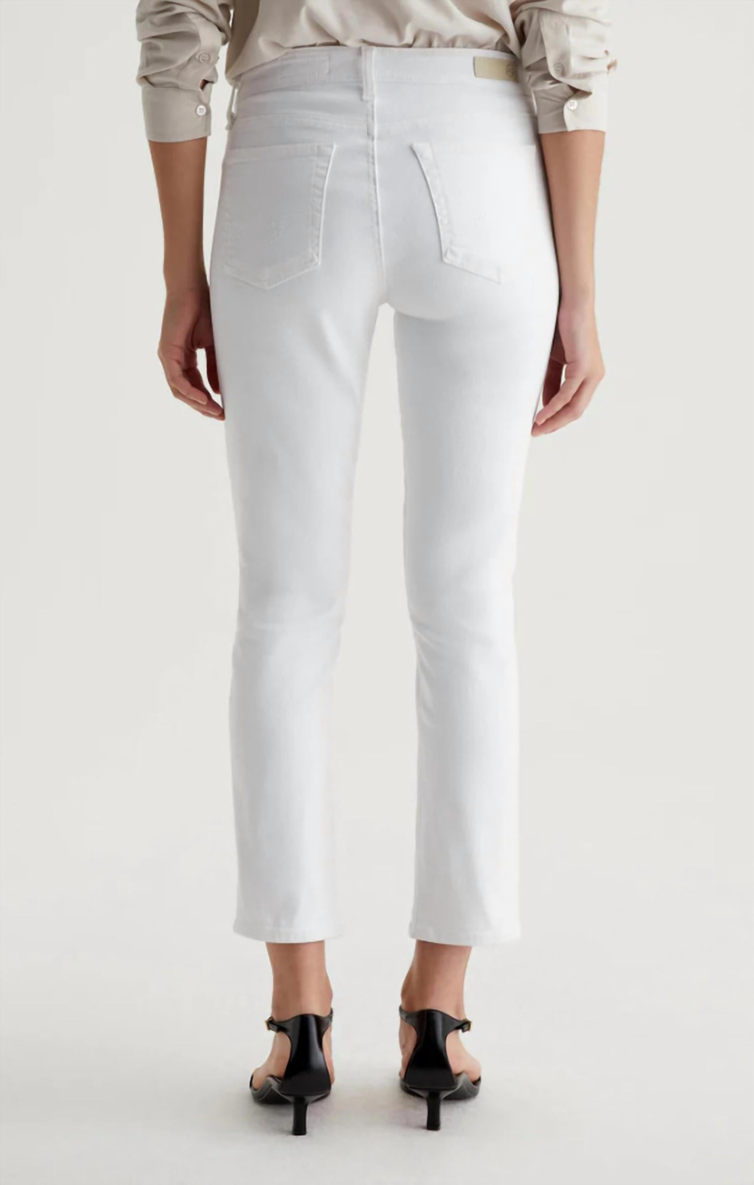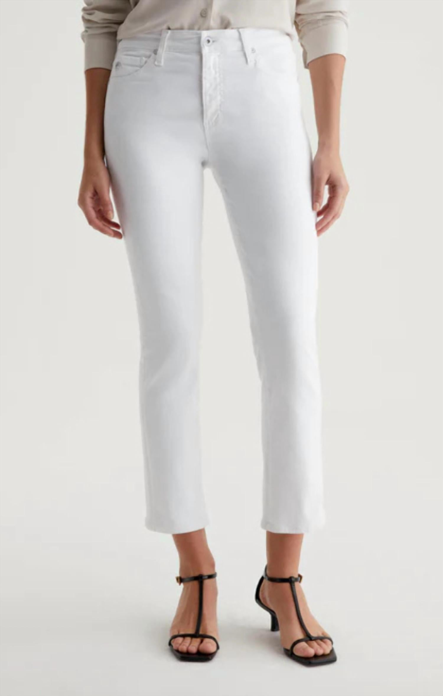 Pair these straight leg jeans with flats, sandals or even heels! You can't go wrong. Discover the Mari Crop Jeans by AG Jeans in chic Gallery White, a staple for any wardrobe. These women's jeans feature a mid-rise slim straight fit with a straight leg and cropped finish, offering an effortlessly stylish look. Crafted from a cotton blend (93% Cotton, 5% Polyester, 2% Elastane) in Cloud Soft Stretch Denim, they promise to get softer with every wear. Designed with functional pockets and a secure button closure, they are convenient for everyday use. Measurements include a 27" inseam, perfect for a minimalist spring ensemble. Easy to maintain, simply machine wash and tumble dry.