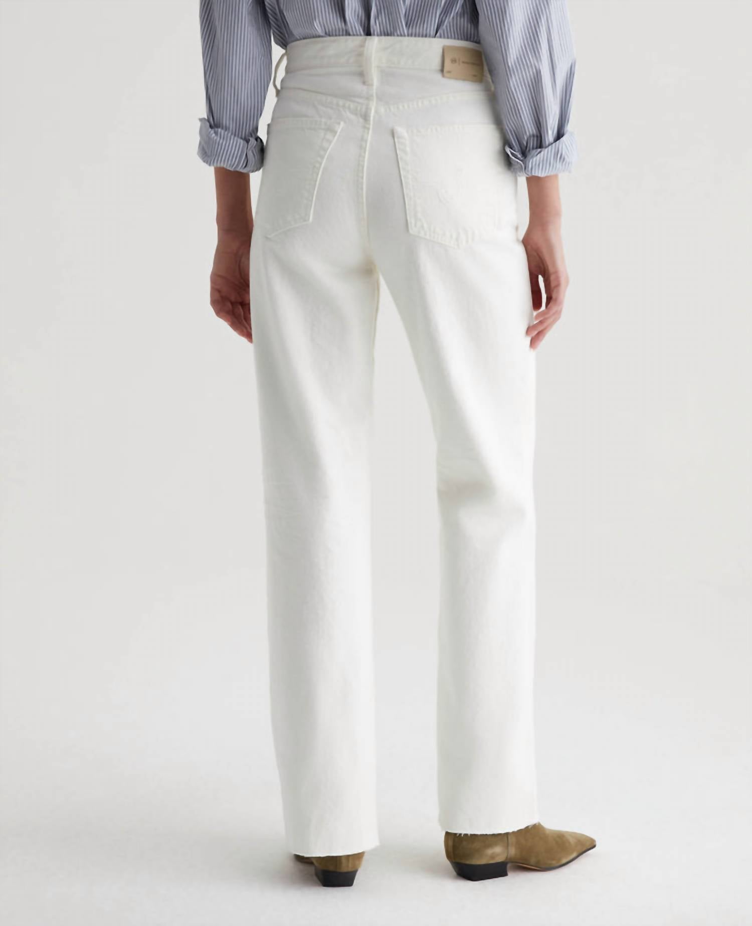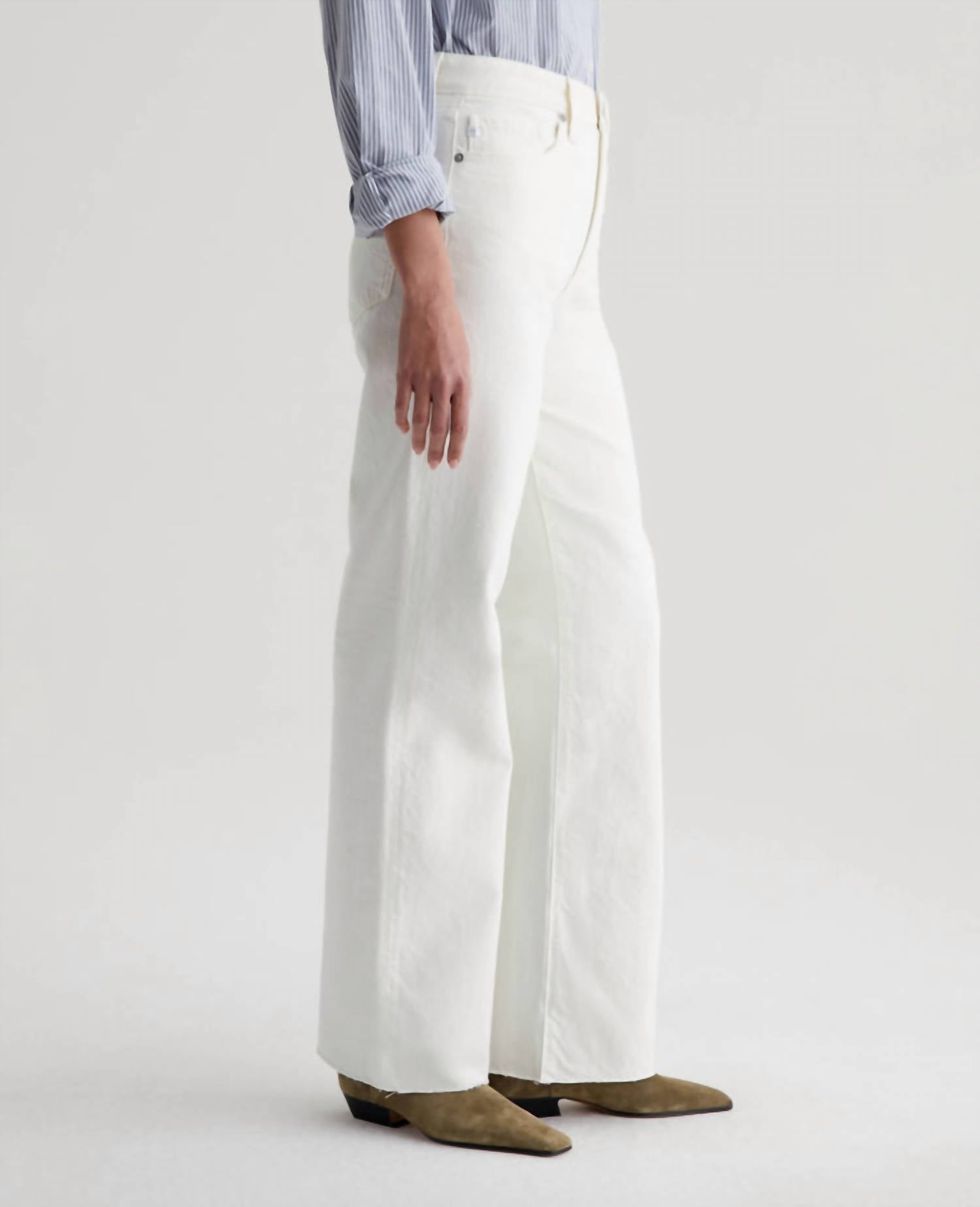 A flattering silhouette that's suprisingly versatile. Elevate your denim collection with the Kora Wide Leg Raw Hem Jeans by AG Jeans, designed in a fresh powder white hue. These jeans feature an ultra-high rise with a relaxed fit, crafted from durable 11.75 oz. Soft Pure Denim in 100% cotton. The classic five-pocket construction is subtly distressed for an authentic worn-in look, complemented by a button closure. Front rise measures 11.5", with a knee opening of 20", a bottom opening of 19", and an inseam of 32". Care: Machine wash. Model wears size 26.