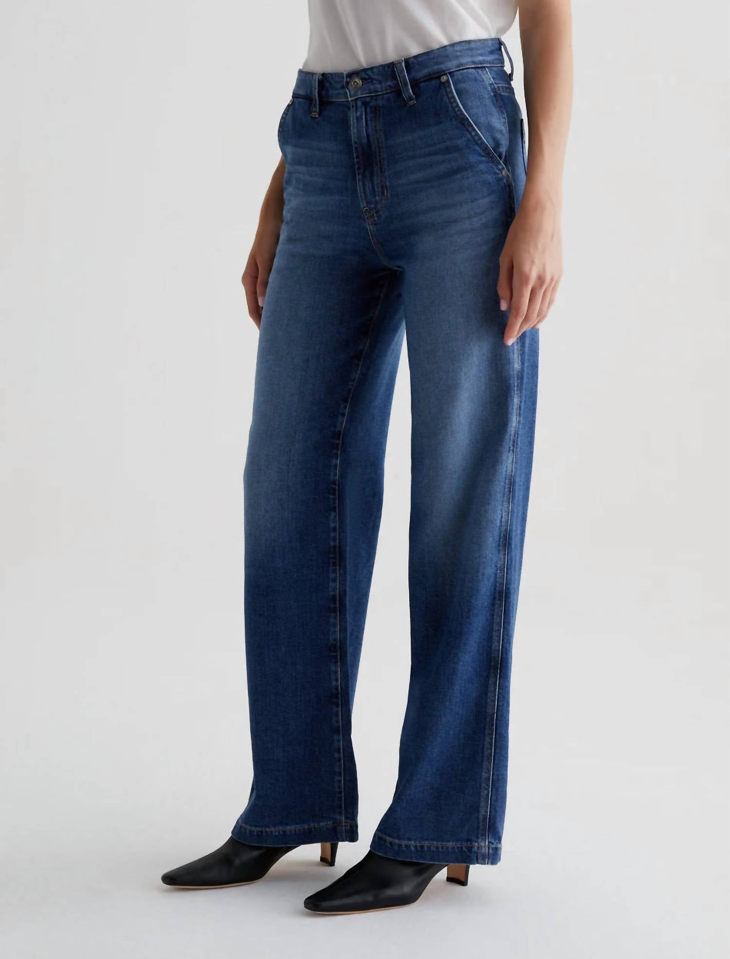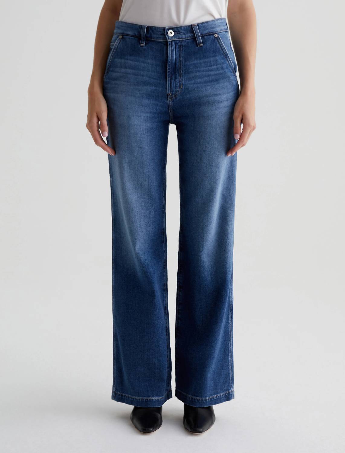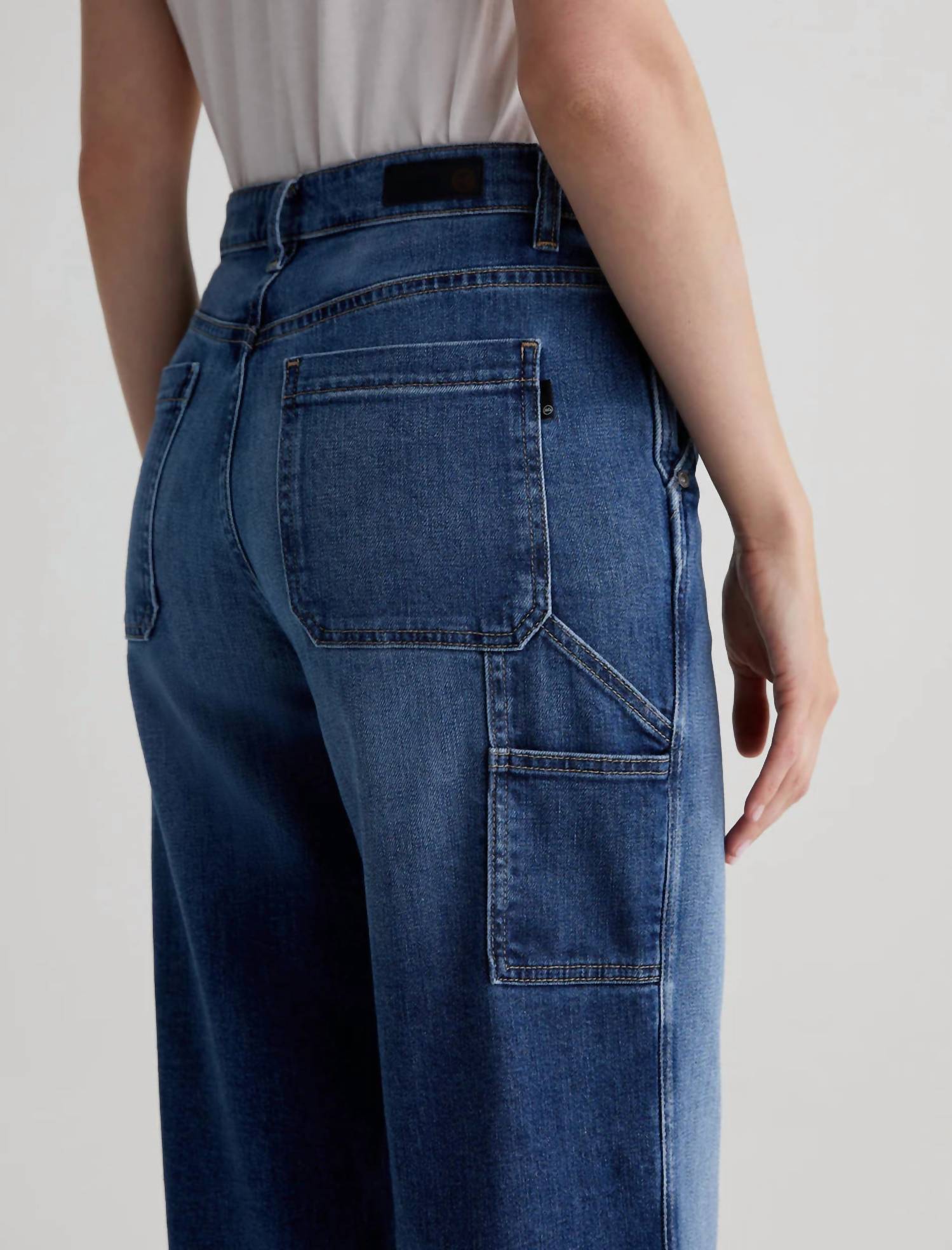 Introducing the Evangelie Carpenter Jeans by AG Jeans, a chic and functional addition to your wardrobe. These women's wide-leg jeans feature an ultra-high waist with practical slash pockets at the front, a hammer loop, and utility-inspired back pockets with a dual tool pocket on one side. Crafted from 10 oz. Daytripper Stretch Denim with a composition of 72% Cotton, 26% Lyocell, and 2% Polyurethane, these jeans offer an easy drape in a medium-indigo wash with marigold stitching. Button closure. Machine wash.