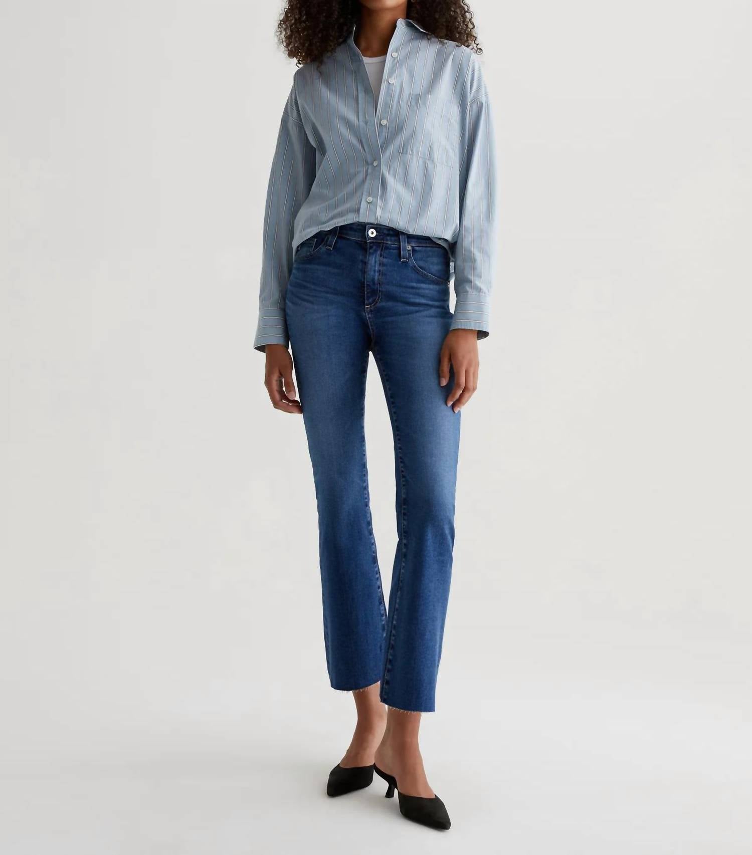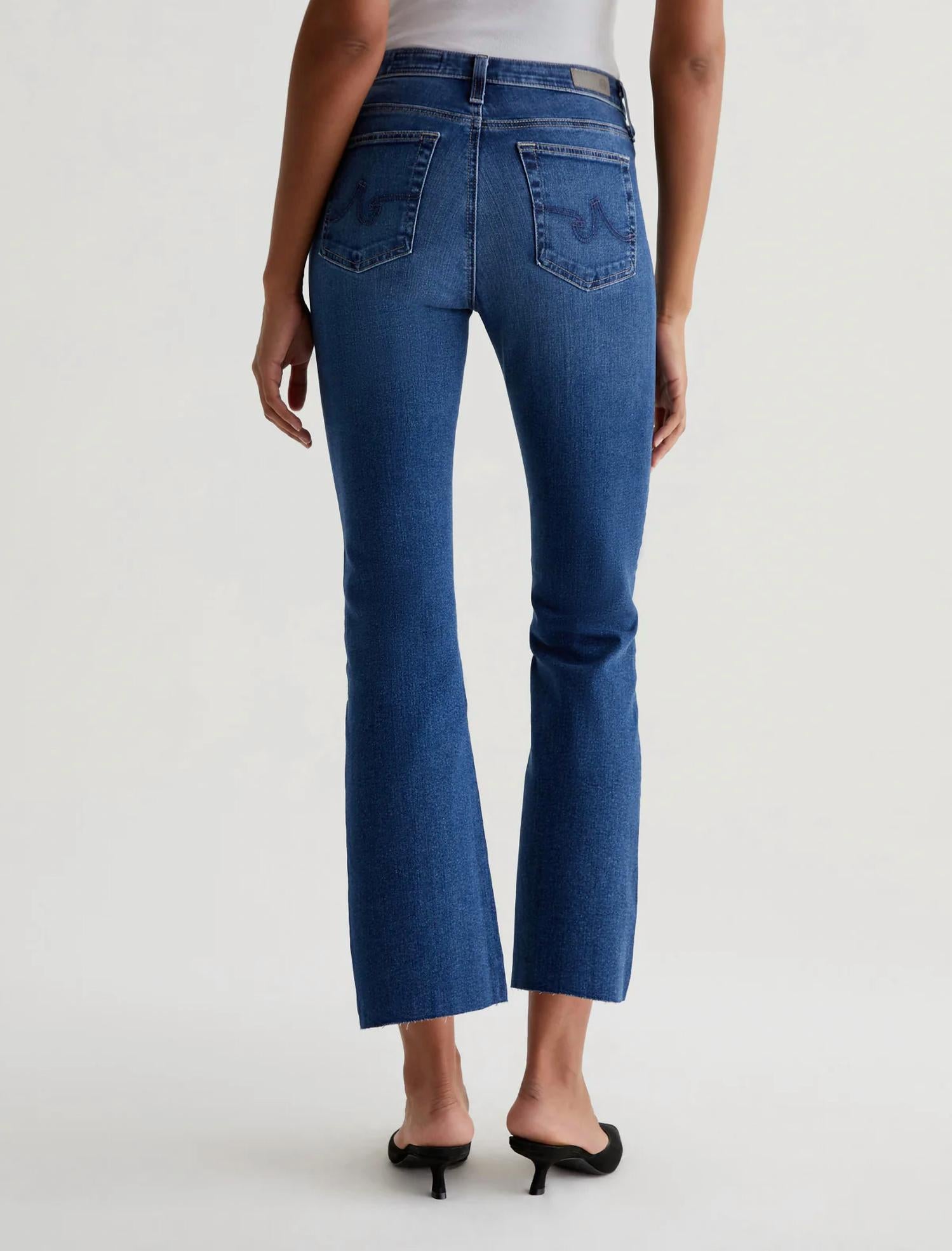 The perfect cropped jean for those transitional seasons. Embrace the Farrah Boot Crop by AG Jeans, a chic addition to your wardrobe in the Lucerne color. These cropped bootcut jeans feature a high-rise, skinny fit through the legs, and open into a subtle flare for a modern 90s vibe. Crafted from 10 oz. superstretch Empower Denim made in Japan, the composition includes 98% cotton and 2% polyurethane for added flexibility. Care: Machine wash. Measurements for size 25 include a 10" front rise, 14" knee opening, 18.5" bottom opening, and a 28" inseam.