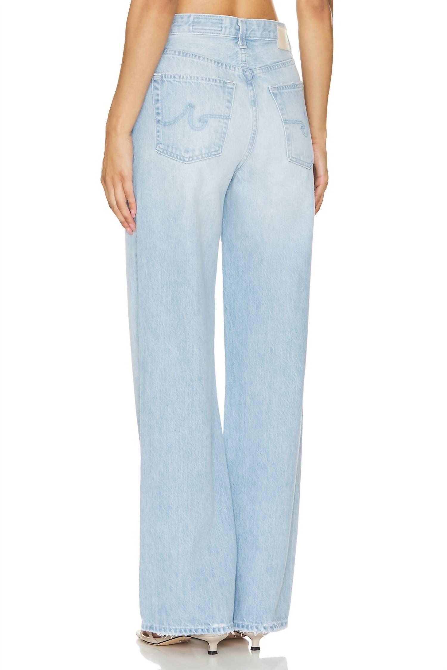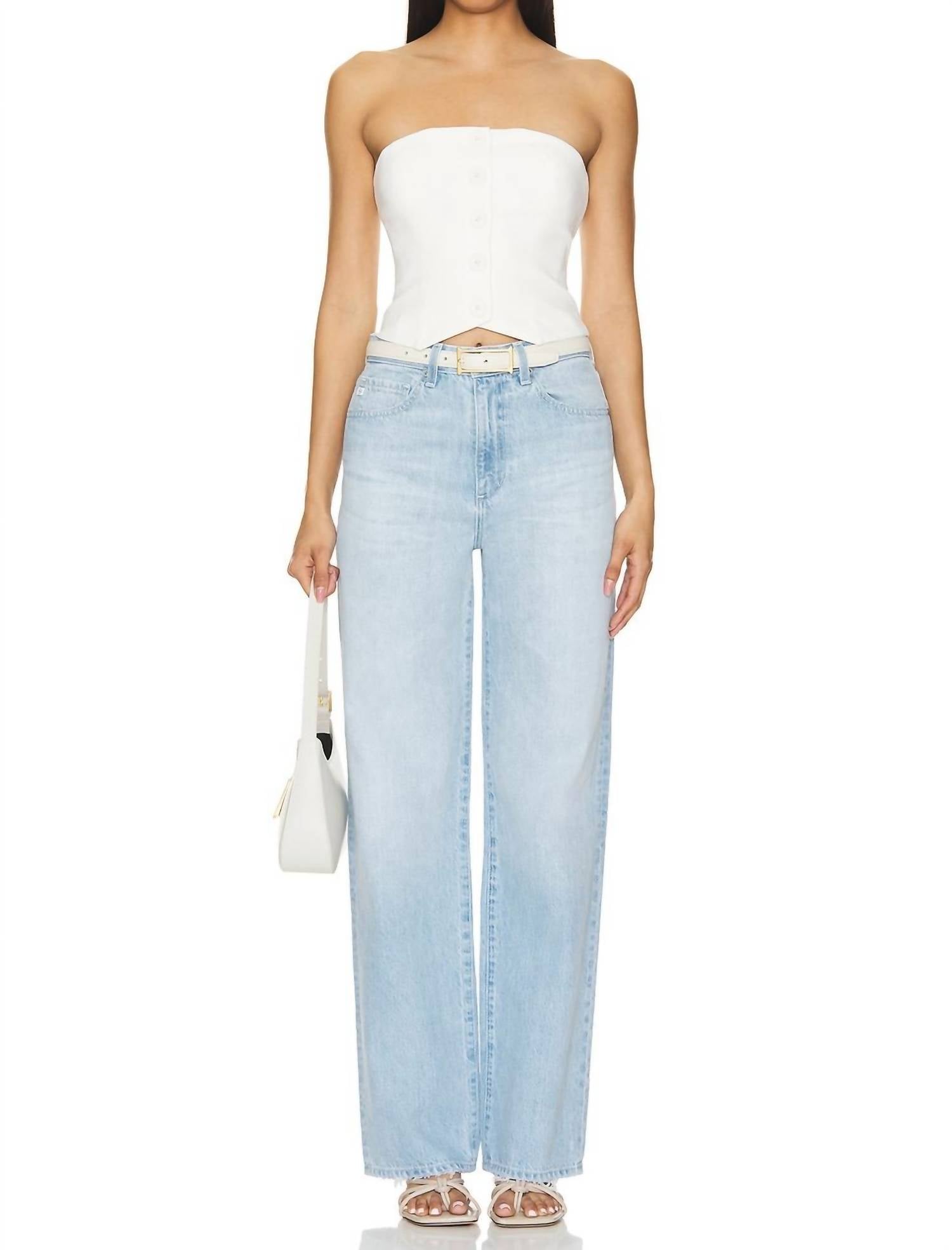 Pair these wide leg jeans with mules, slides or your favorite strappy sandals. Introducing the Kora High Rise Wide Leg Jeans by AG Jeans in the stylish Sunset Blues hue. This pair boasts an ultra-high rise with a relaxed wide-leg fit, featuring a front rise of 11.5 inches and a 32-inch inseam for a flattering silhouette. Crafted from 100% cotton, these jeans are made from 13 oz. Sioux Rigid Denim in Mexico, offering a light stonewash with vintage fades and worn edges. The zipper fly with button closure provides secure wear, and the jeans are designed for easy care with machine wash instructions.