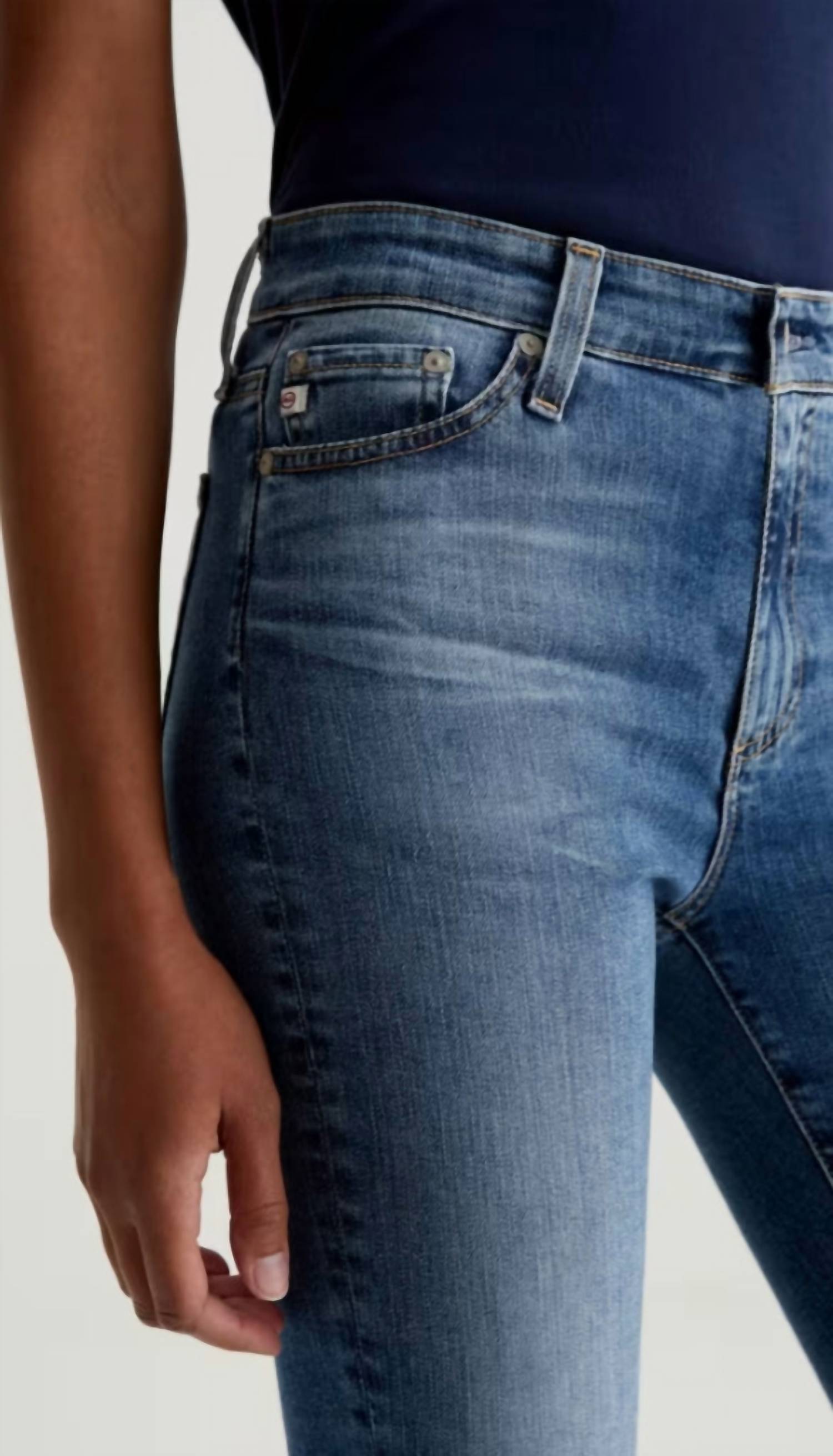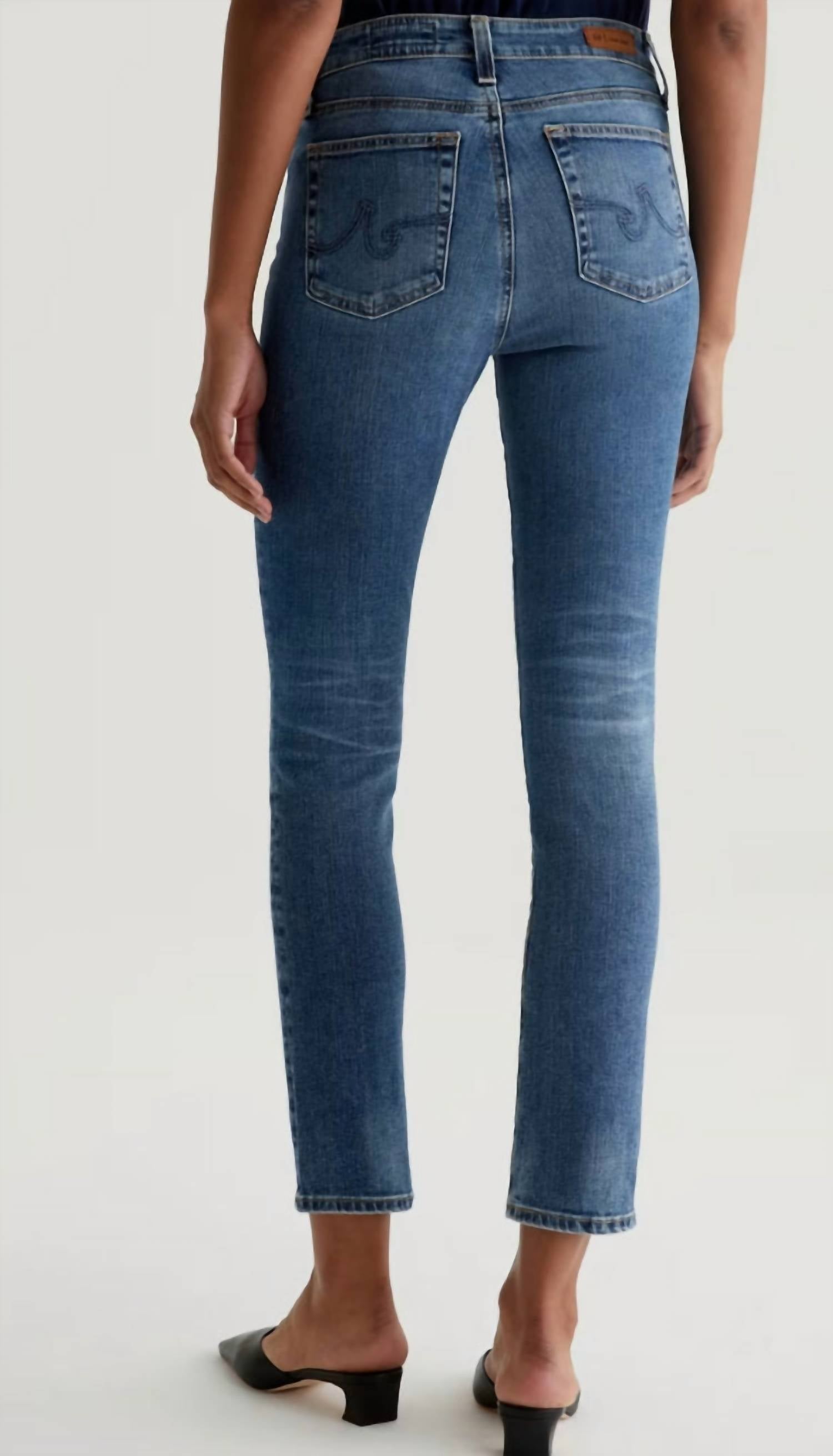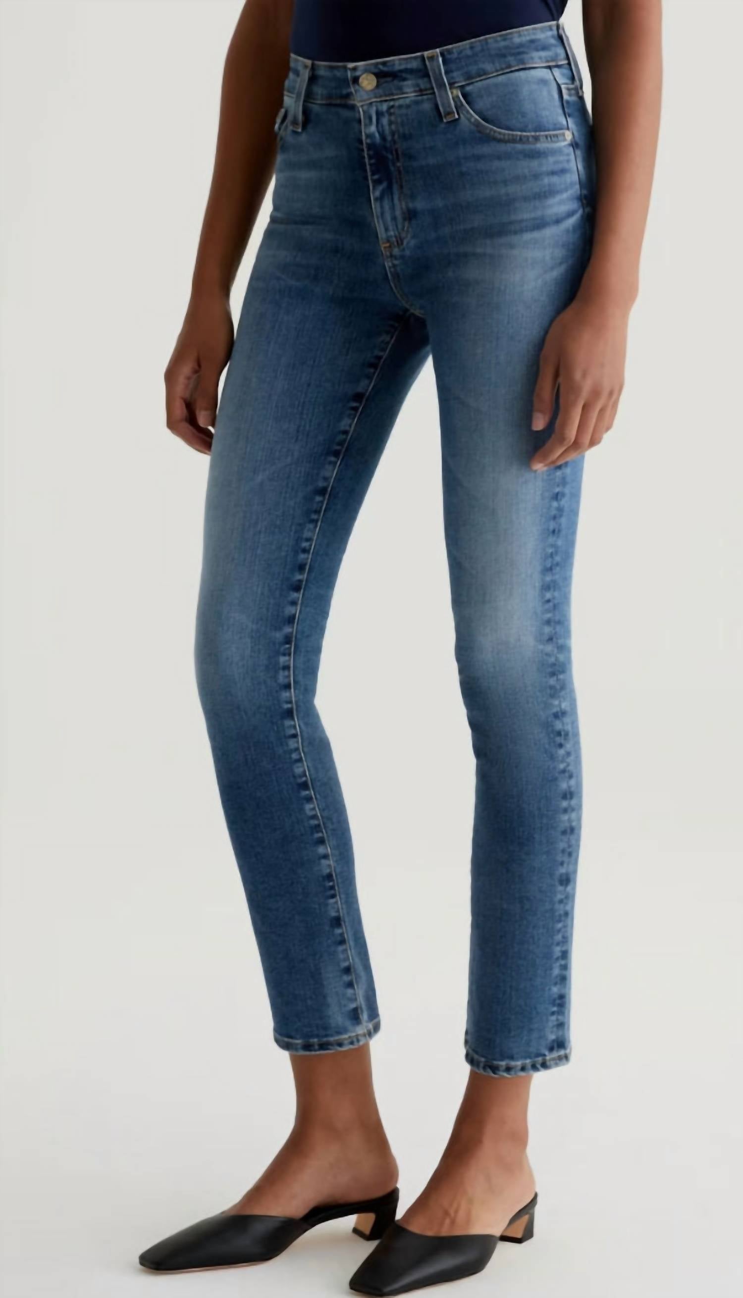 The perfect cropped jean for those transitional seasons. Introducing the Mari High Rise Slim Straight Jeans by AG Jeans, a perfect blend of style and comfort. Featuring a medium indigo wash with a 15-year vintage fade, these jeans are crafted from 10 oz. Rouge Advanced Stretch Denim for an effortless fit. With a flattering mid-rise waist, zip closure, and a slim leg opening, they are designed to fit easily around the hips. Composition: Cotton. Care: Machine wash, line dry. Model is wearing size 26 with dimensions - Front Rise: 9 3/4", Knee Opening: 14", Bottom Opening: 13", Inseam: 29".