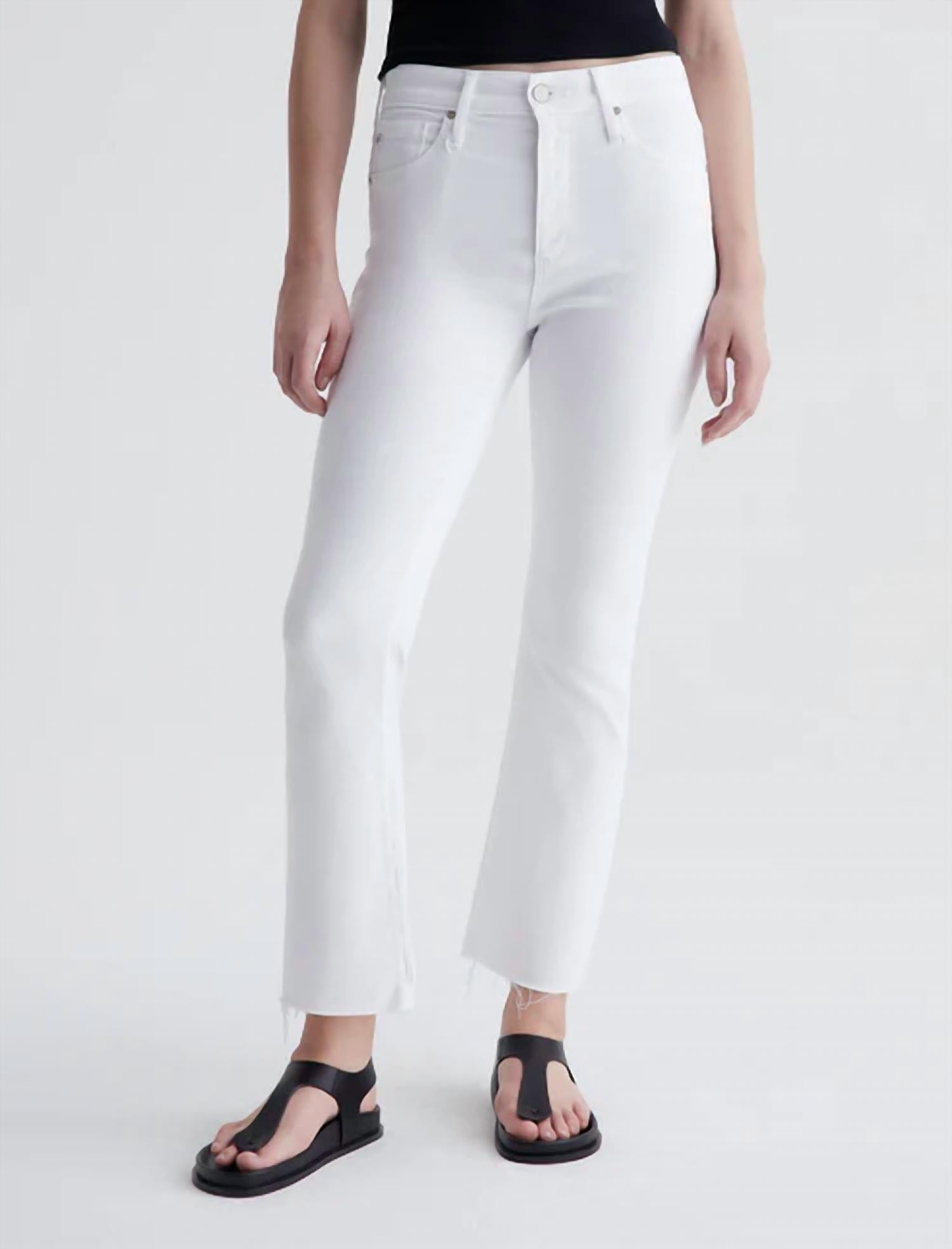 The Farrah Boot Crop jean is a high-rise cropped bootcut silhouette in bright white denim. The pair has a skinny fit through the leg before opening into a subtly flared raw hem. Made from AG's exclusive AG Cloud Soft Denim™, this women’s bootcut jean is designed in 9.7 oz. Hyper-Soft Stretch Denim, a left-hand twill fabric that allows the yarns to gently relax and untwist for a supple, velvety-soft feel. It's designed to get even softer as you wear it. Super-stretch construction offers added comfort and enhanced recovery. AG Cloud Soft Denim™, Hyper-Soft Stretch Denim, 9.7 Oz. 56% Cotton, 19% Modal, 18% Lyocell, 6% Polyester, 1% Elastane. Model is wearing a size 25. Front Rise: 10" Knee Opening: 14" Leg Opening: 18.5" Inseam: 28"