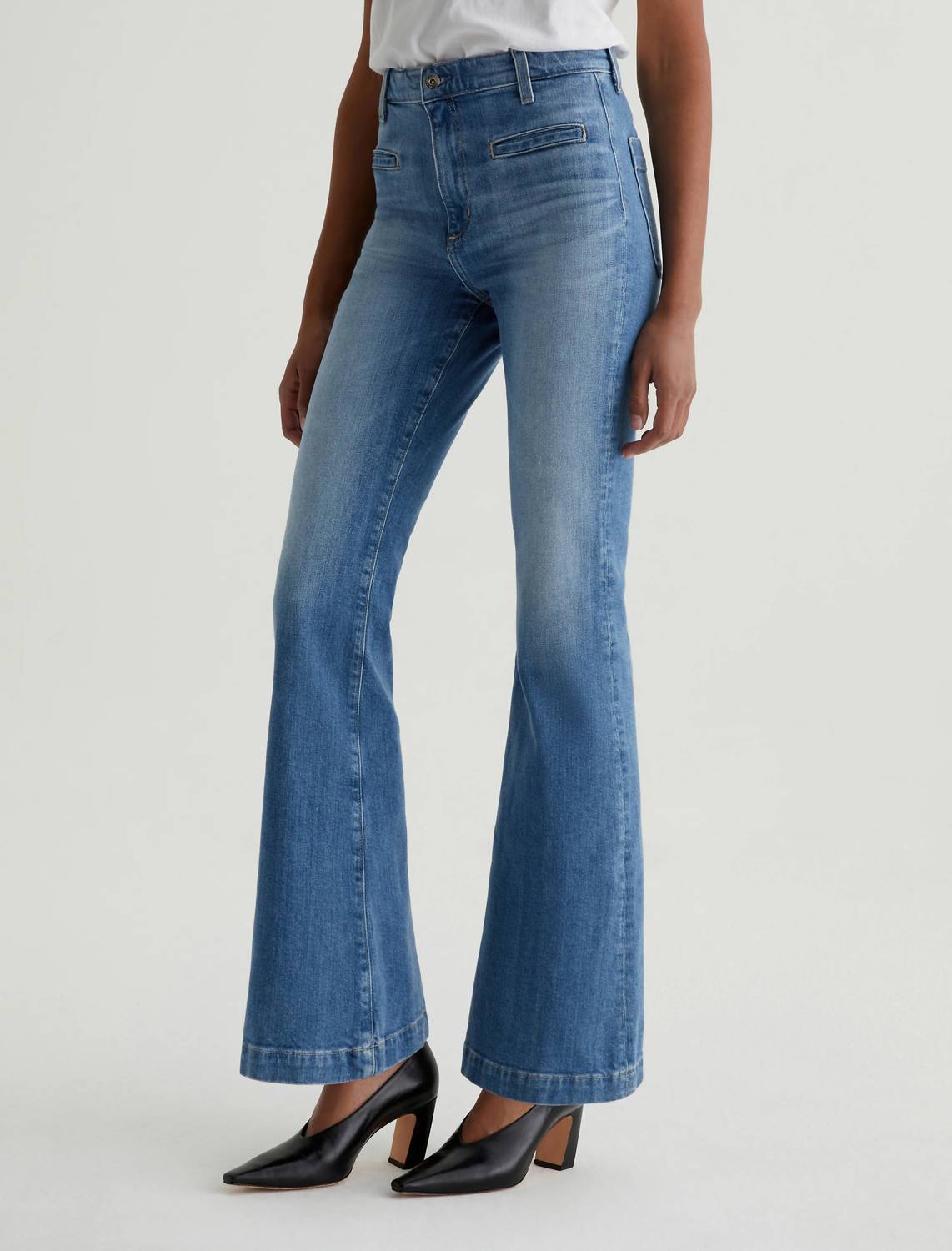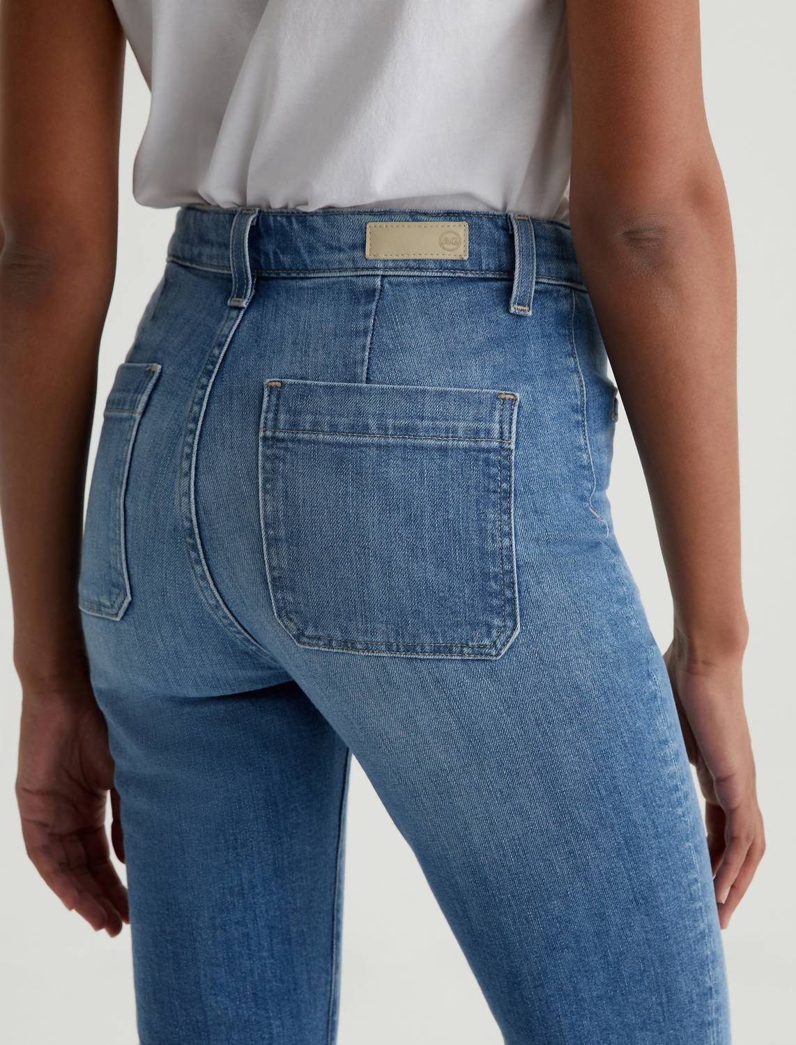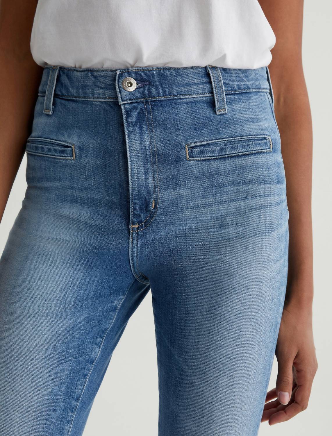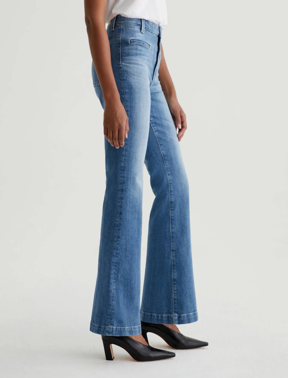 Pair these wide leg jeans with mules, slides or your favorite strappy sandals. The Desi High Rise Flare Jean by AG Jeans offers a '70s-inspired style with a high-rise fit that hugs the hips and elongates the legs. Made from 11.75 oz. Vintage Comfort Stretch Denim, this piece combines a medium wash with fading for a classic look, featuring a front rise of 11", knee opening of 15 1/2", bottom opening of 22", and an inseam of 33". Composition: 98% Cotton, 2% Elastane. Closure: Zip closure. Pockets: Front welt pockets and back patch pockets. Care: Machine wash. Model is wearing a size 26.