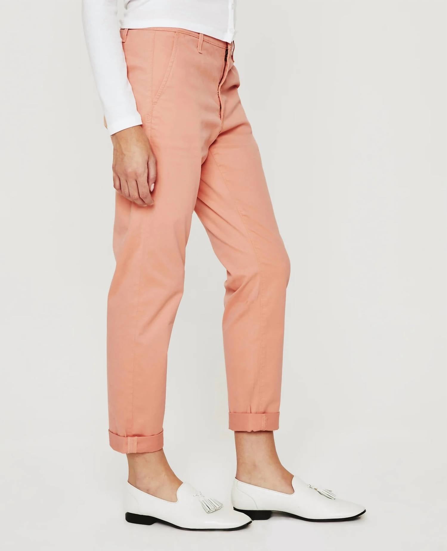 Introducing the Caden Tailored Trouser by AG Jeans in a refreshing Watermelon Sorbet color, perfect for a minimalist spring look. These women's trousers are crafted from 97% Cotton and 3% Elastane, featuring a straight leg and a convenient button closure. Designed with a solid pattern, the trousers offer a flattering rise of 9.5 inches and a comfortable inseam of 27 inches. Ideal for a Thanksgiving dinner party, these tailored trousers come with pockets for added functionality.