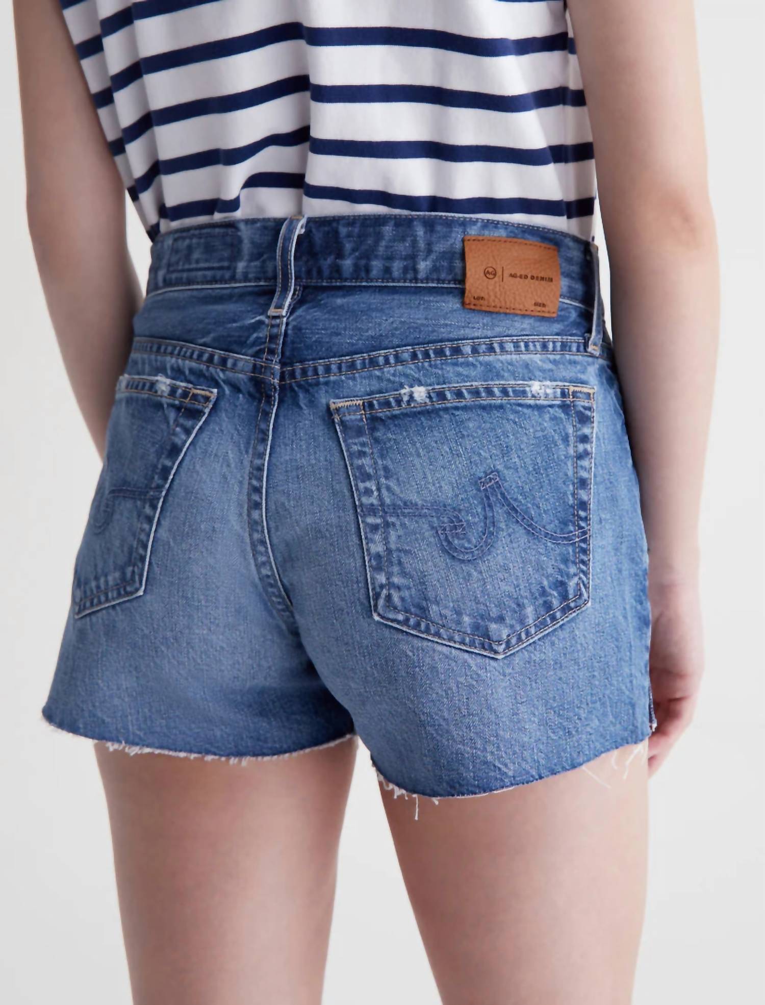 Jean shorts so versatile, you can literally wear them with anything. Meet the Hailey Cut-Off Short by AG Jeans, crafted for women in a medium indigo solid color, perfect for your summer streetwear style. These shorts feature a high-rise waist and a relaxed silhouette with a front rise of 10" and bottom opening of 22.5". Made from 11.75 oz. Legion Denim, these shorts are composed of 100% Cotton with a button closure and have a 3.5" inseam. To maintain their quality, machine wash and tumble dry as needed, accentuating its lived-in character with distressed pockets.
