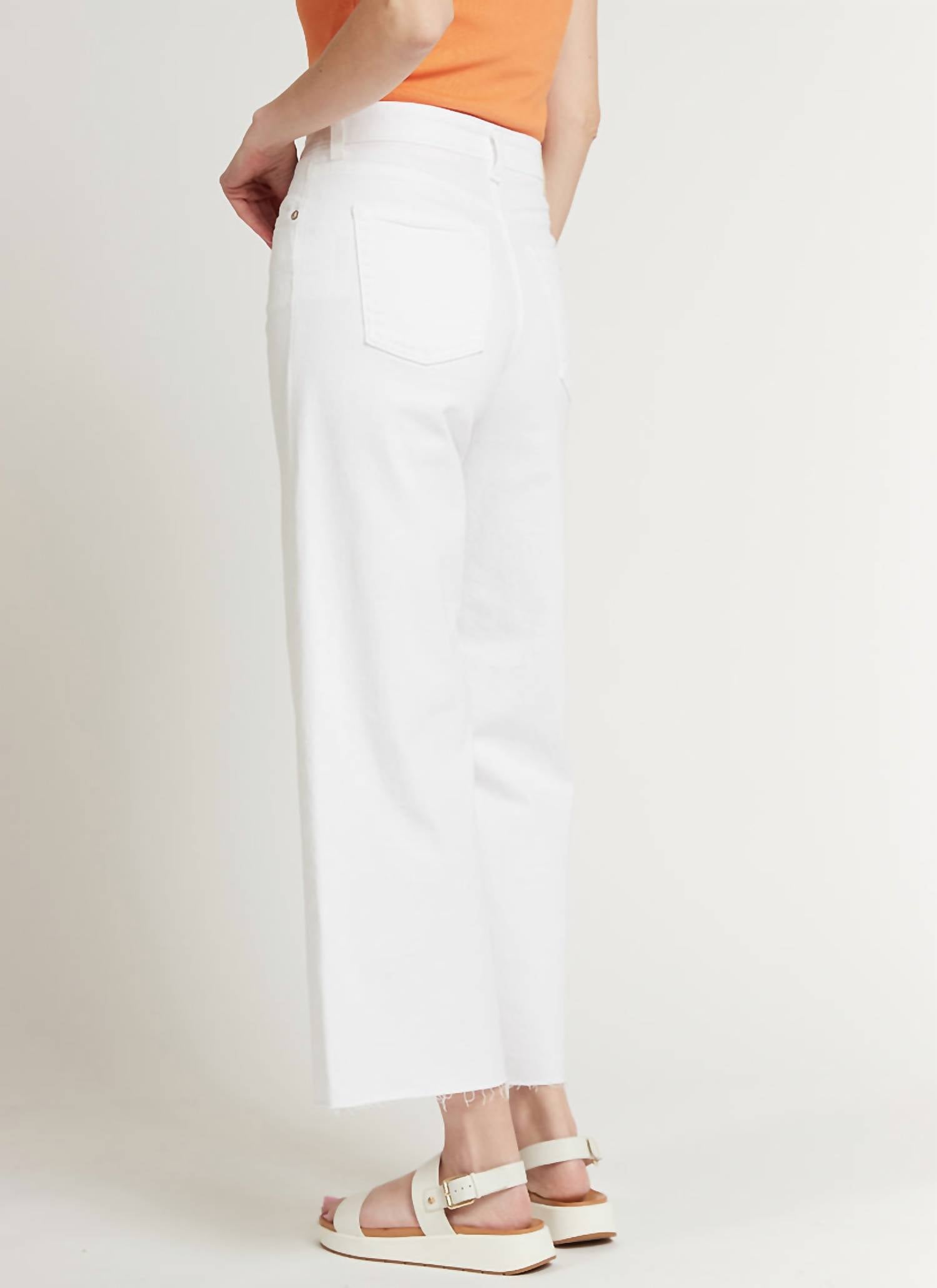 A flattering silhouette that's suprisingly versatile. High-rise silhouette in a modern white wash with raw hems. Crafted from premium stretch-denim, these wide-leg jeans feature an angled yoke and slightly forward side seams. True to size. Machine wash cold. 93% Cotton, 6% Polyester, 1% Spandex. Front Rise: 10 1/4". Waist Rise: High. Inseam Length: 27". Leg Opening: 20"