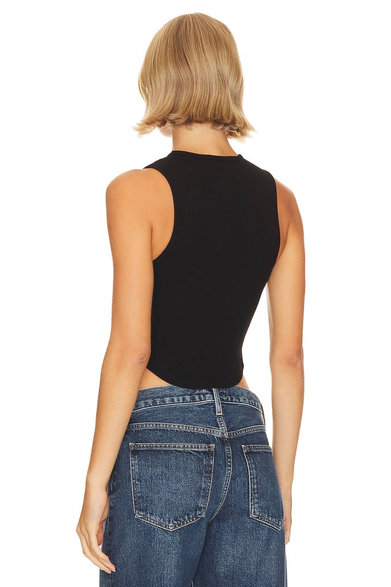The perfect tank top for those warmer weather seasons. Discover the Nova Tank Top by AGOLDE, an essential addition to your summer wardrobe in stark black. This sleeveless tank is designed with a high crewneck and a flattering curved, cropped hem, making it a great match for low-rise denim. Crafted in a supportive, breathable ribbed knit, its composition includes 49% organic cotton, 49% lyocell, and 2% spandex. Proudly made in the USA, this pull-on style is machine washable for easy care.