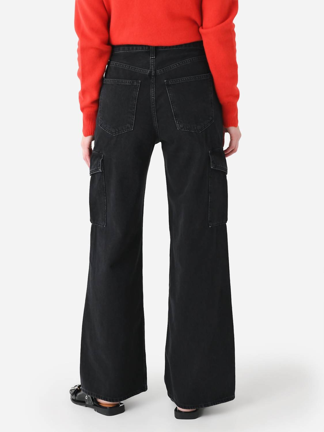 High rise - 12 in. Button, zip-fly closure. Belt loops. 4-pocket styling. Cargo pockets. Wide leg silhouette. Inseam: 32 in. Denim fabrication. 80% cotton, 20% recycled cotton. Classic fit.