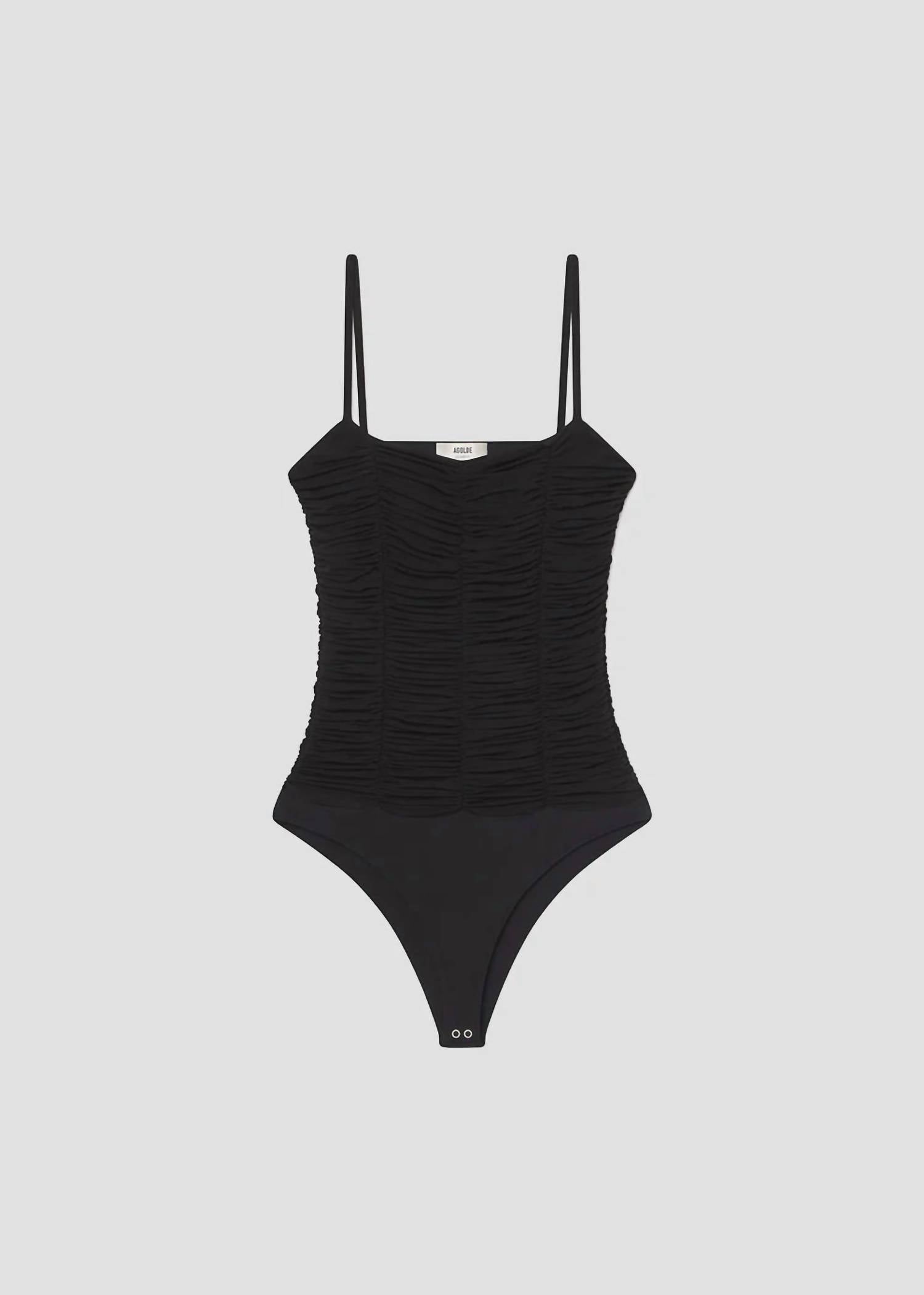 Pair this number with your favorite high-waisted jeans. Discover the Ezra Bodysuit by AGOLDE, a chic staple in a true clean black hue. Featuring spaghetti straps and crafted from a lightweight viscose blend with 94% Viscose and 6% Elastane, it offers a textured, smooth feel. Made in the USA with imported materials, it promises a perfect silhouette with ultra-fine shirring throughout. Care for this bodysuit with machine wash instructions, ensuring lasting quality and fit.