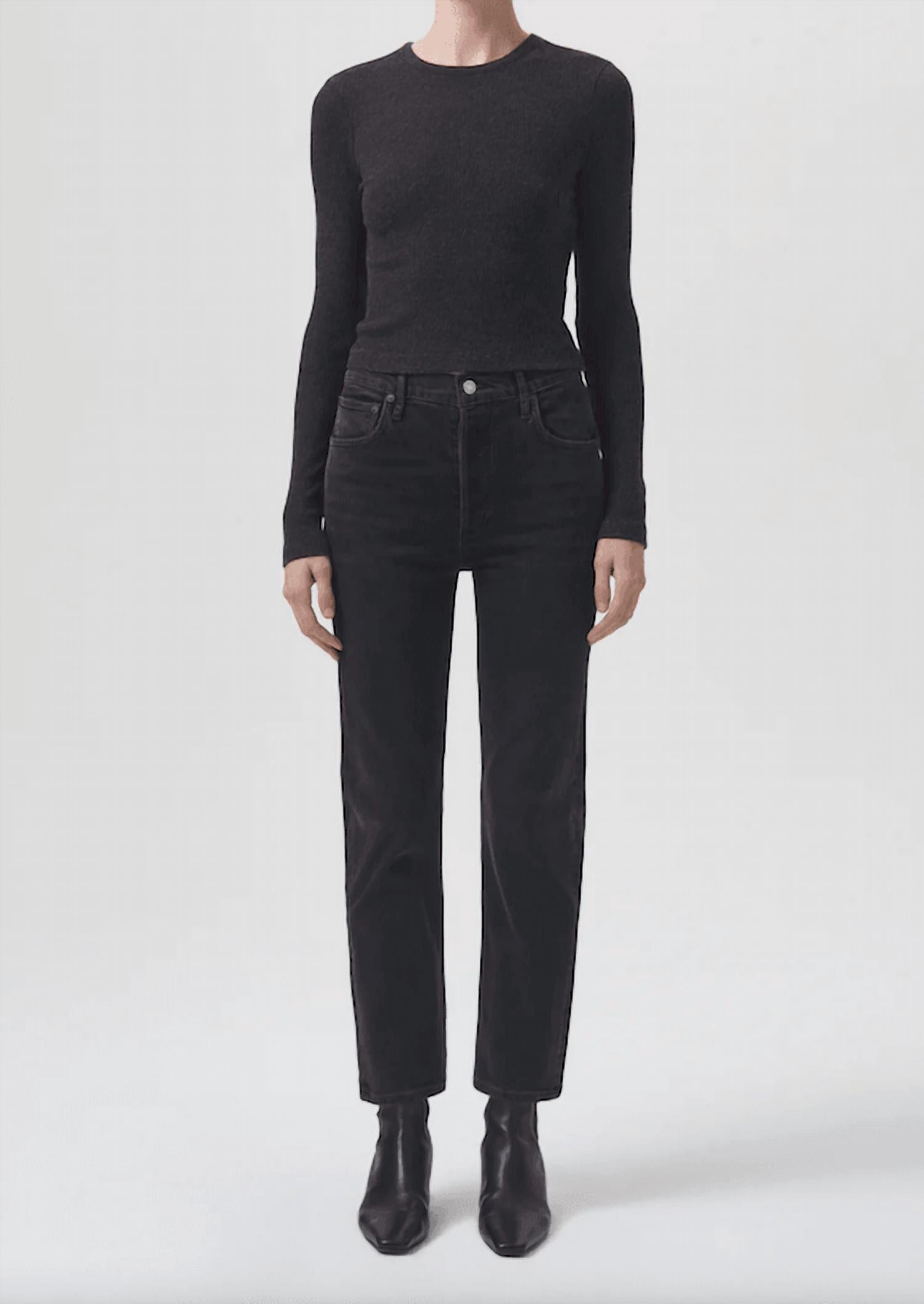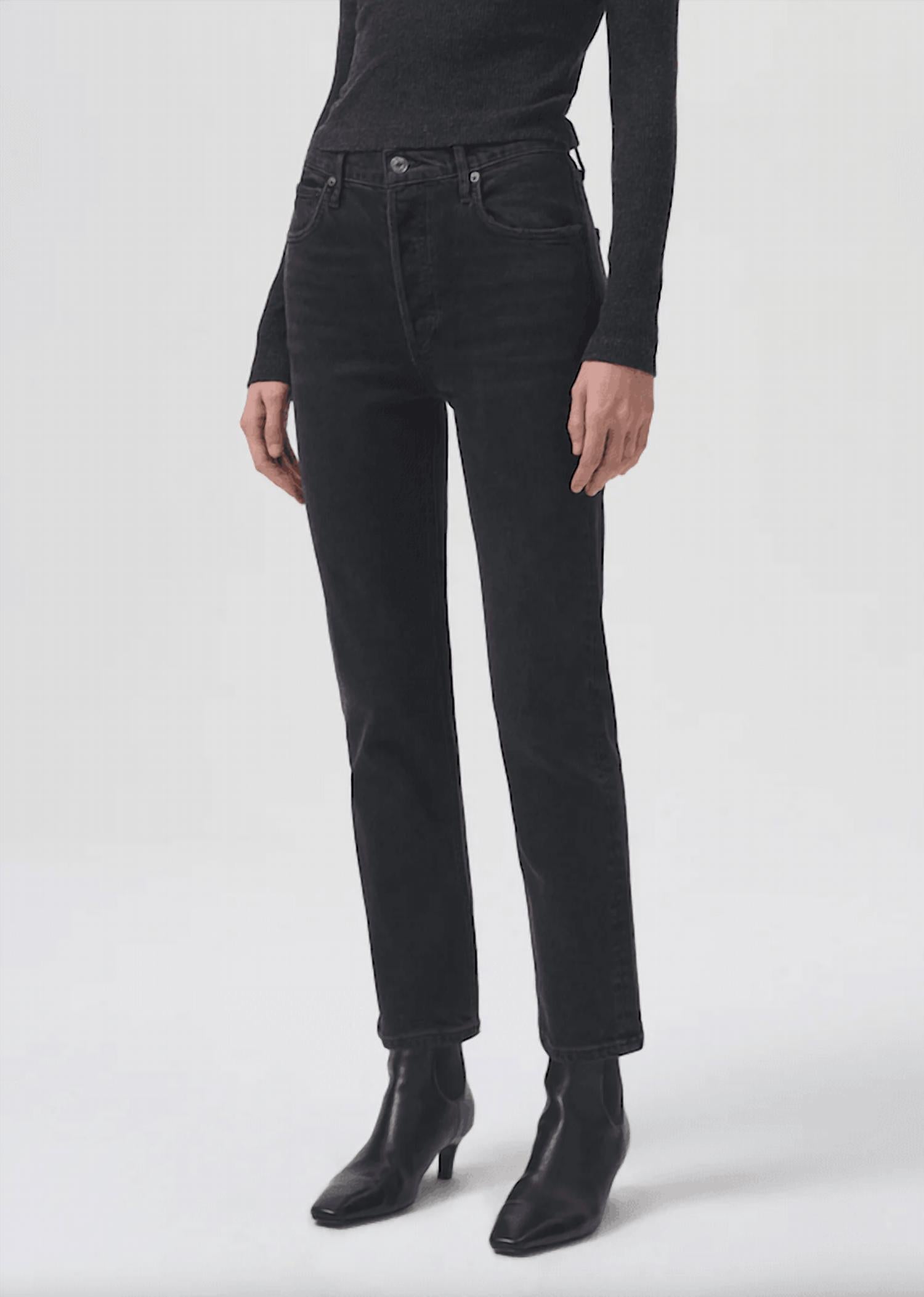 Pair these straight leg jeans with flats, sandals or even heels! You can't go wrong. Introducing the Riley Long Straight Jeans by AGOLDE, a must-have for any woman's wardrobe, especially those who appreciate a 90s fashion trend. Designed in a stunning Panoramic Black, these jeans feature a high-rise waist, slim fit, and a 34-inch inseam for a flattering look. Made from a cotton blend with a stretch denim construction, they provide both comfort and style while maintaining their shape. Closure: Zip closure. Care instructions include machine wash and tumble dry, which makes upkeep a breeze.