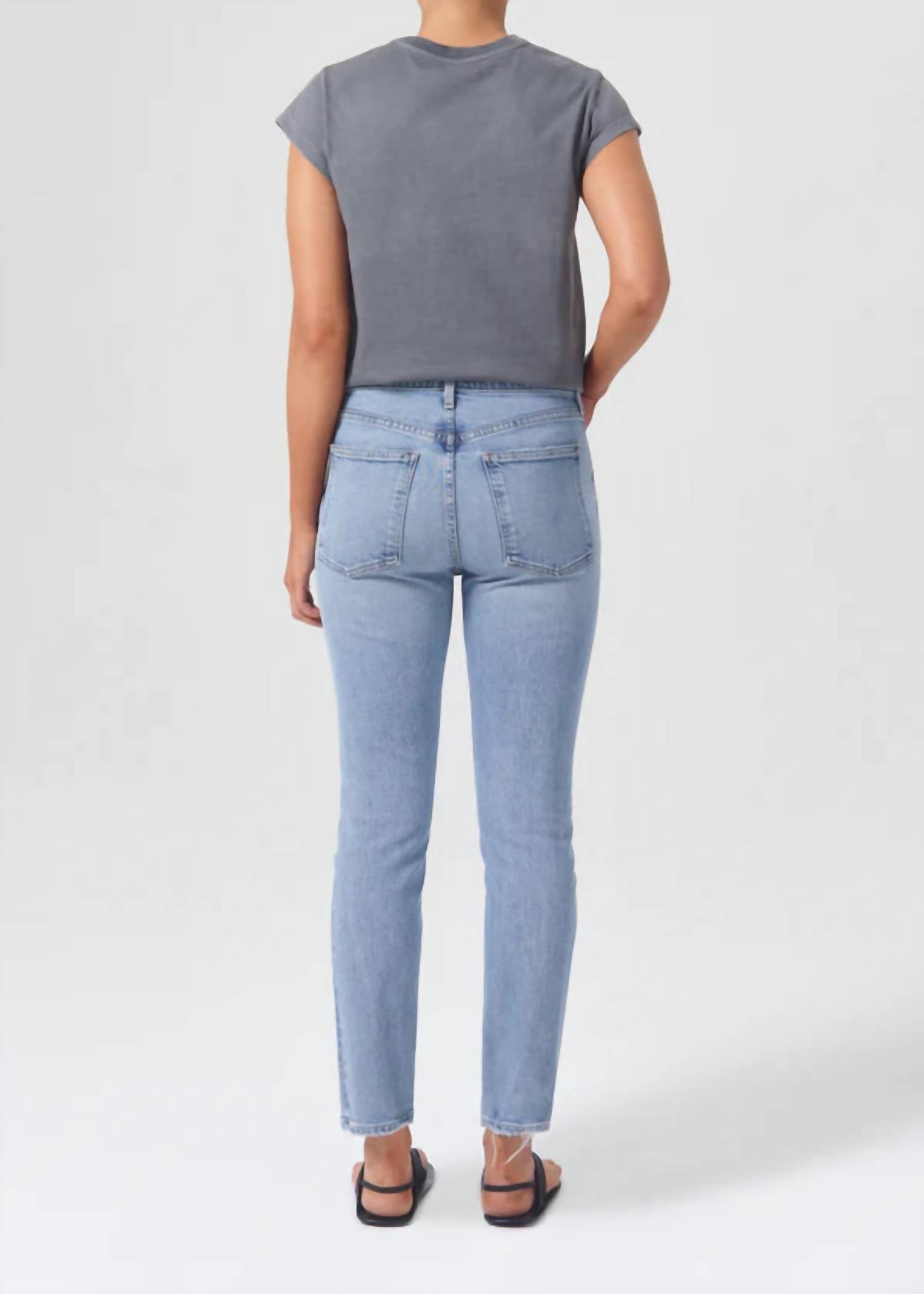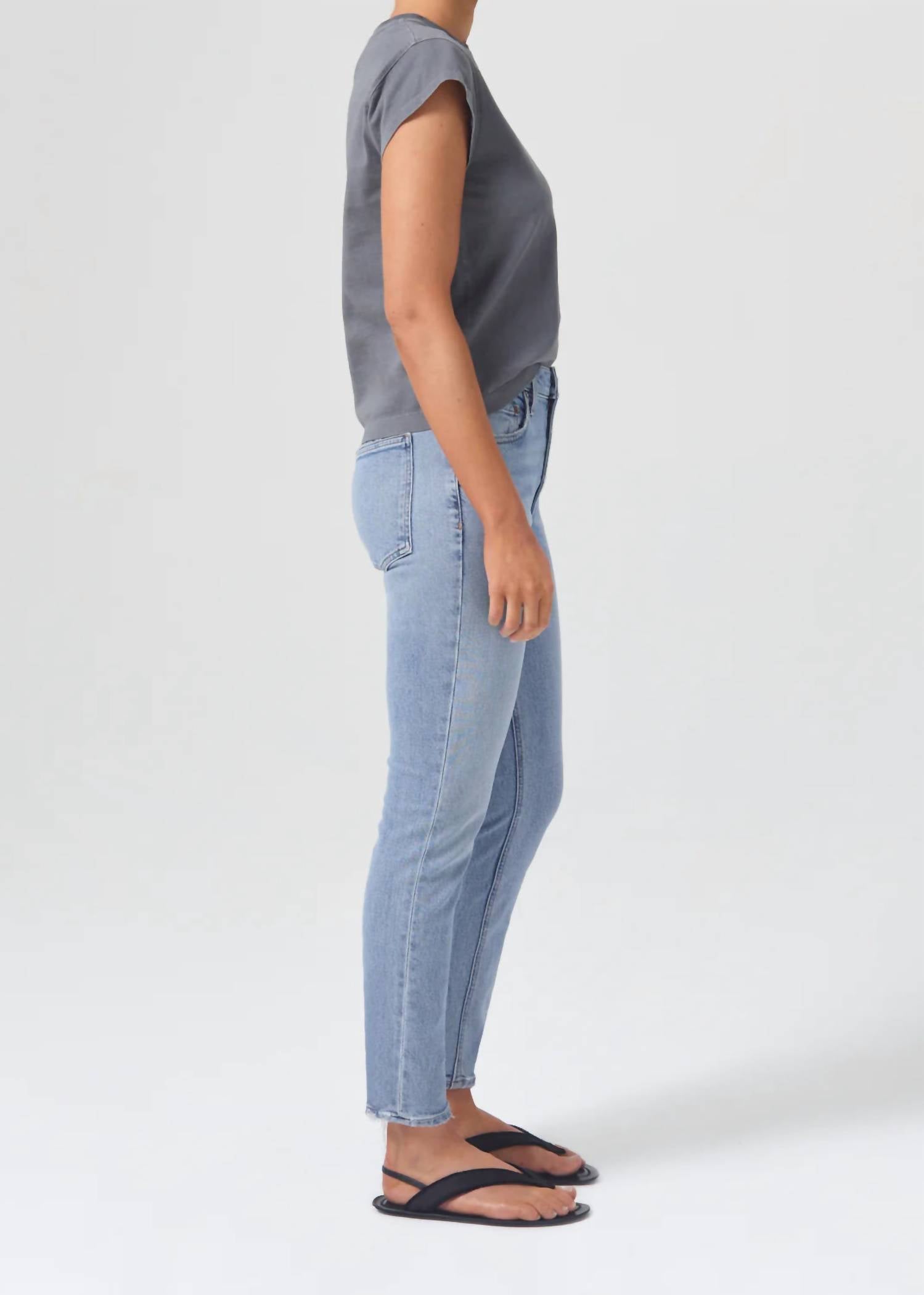 These must-have jeans are fit to perfection. Discover your new wardrobe staple with the Willow Mid Rise Slim Jean by AGOLDE, featuring a flattering mid-rise waist and slim straight leg style. Expertly crafted in a cotton blend with 59% organic cotton, these jeans offer comfort with a touch of stretch. The light washed vintage indigo finish with soft fading enhances its minimalist appeal, perfect for spring outings or a dinner party. Closure: Zip fly. Care: Machine wash cold inside out with like colors, tumble dry. Model is 5'10" and is wearing a size 27. Rise: 10.5", Inseam: 27.5", Leg Opening: 12.5".