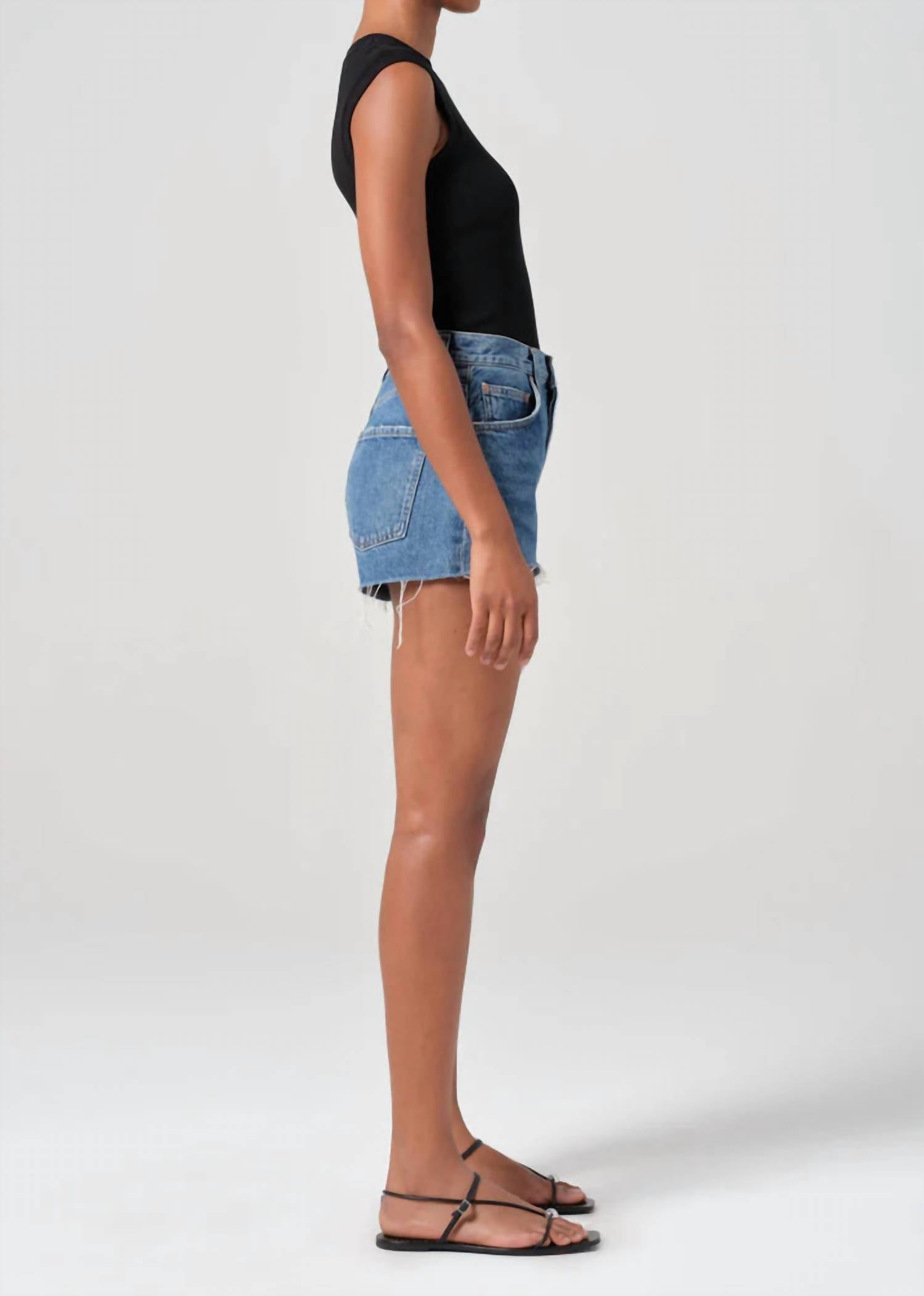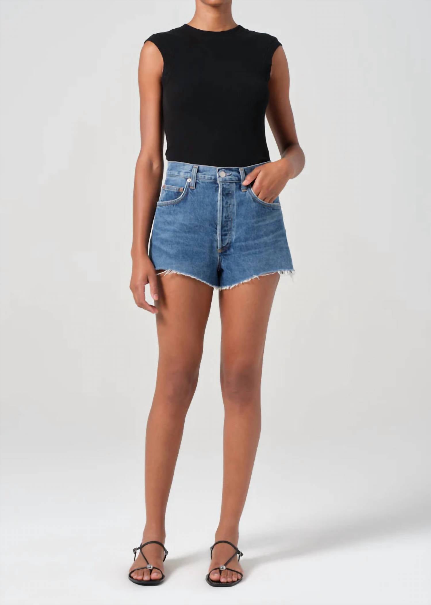 Not only cute but extremely comfortable. The jean shorts you will be reaching for all season long. The Ridley High-rise Short by AGOLDE in the Enamour shade is a must-have for any fashion-forward wardrobe. Crafted from 100% regenerative cotton, these vintage-inspired shorts boast a sleek, high-rise fit with a 12 1/8" rise and 2 1/2" inseam, providing a structured yet comfortable feel. Made in Turkey, they feature a solid pattern and convenient button fly closure for a polished finish. Care is simple with machine wash cold instructions; ensure you tumble dry low. Model is 5'10" wearing size 27 with a leg opening of 25 1/2", perfect for pairing with your favorite summer streetwear looks.