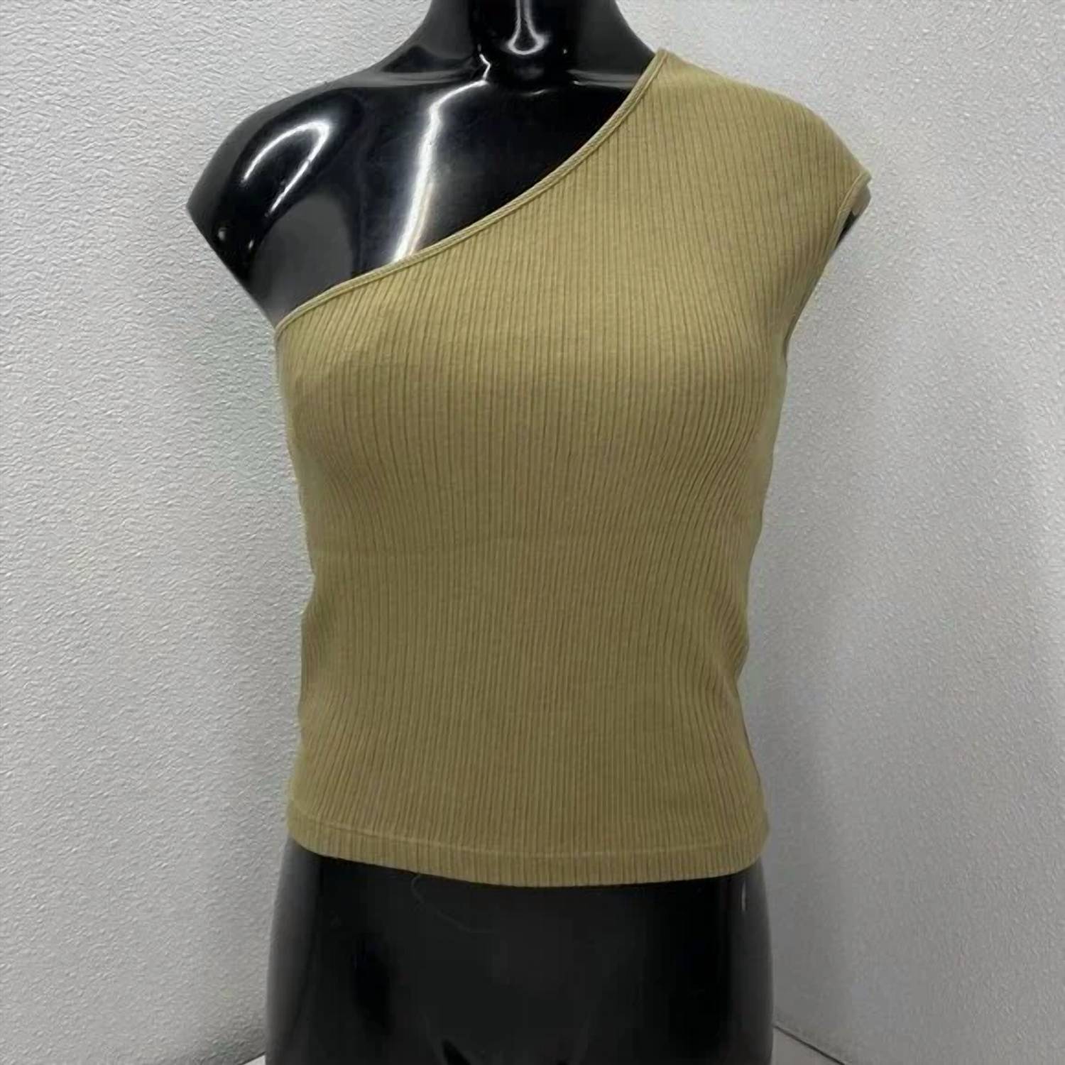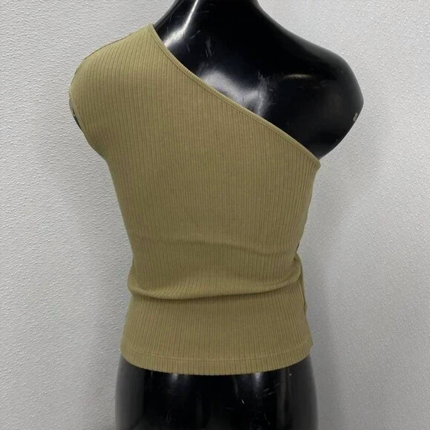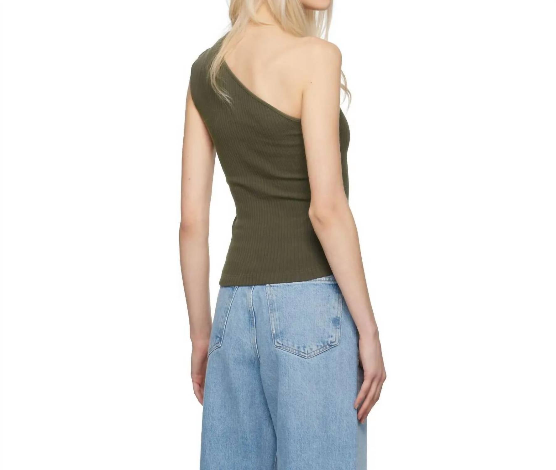 Introducing the Nessa Ribbed One-shoulder Tank Top by AGOLDE, a minimalist piece perfect for your spring concert outings. This sleeveless design in olive green is crafted from a form-flattering textured rib, featuring a close fit with a single-shoulder sleeve. Composition: 95% Organic Cotton, 5% Spandex. Made in the USA with imported materials. Closure: Pull on. Care: Machine wash cold, lay flat to dry.