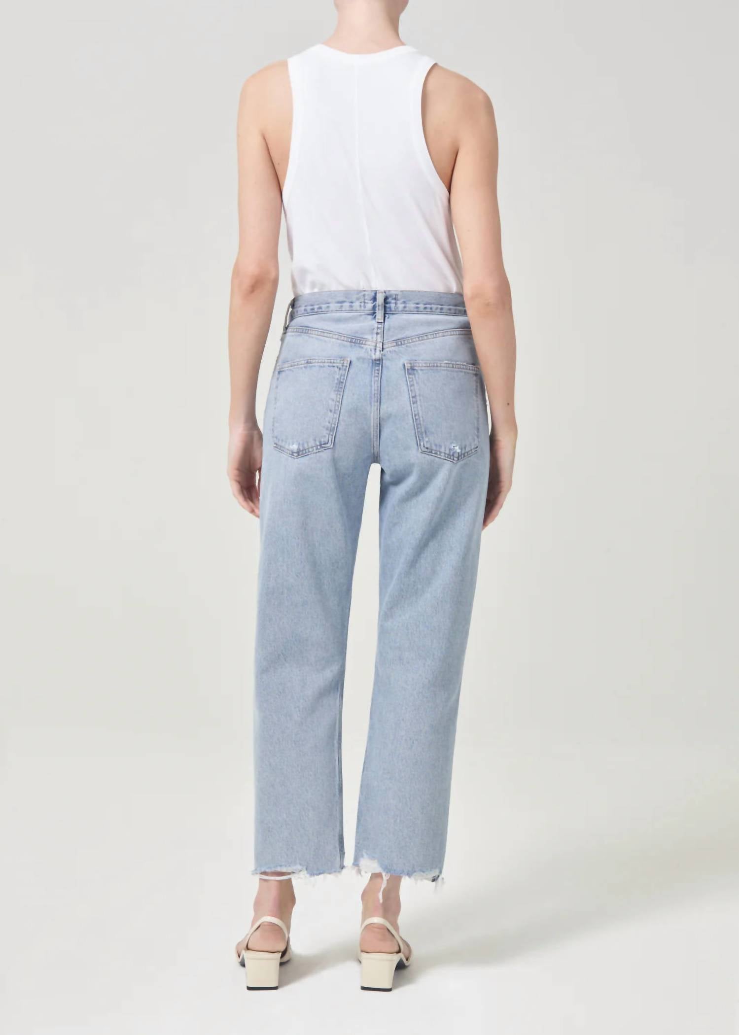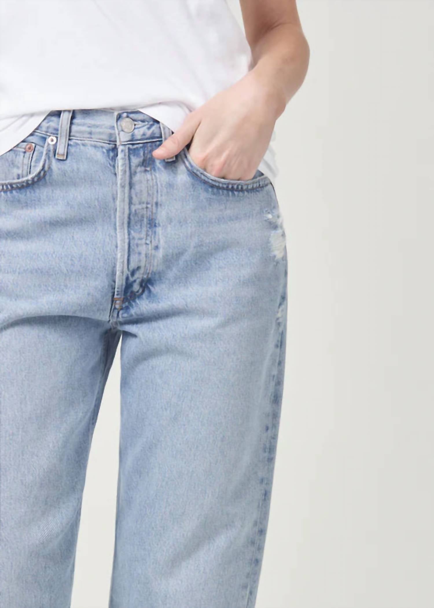 Pair these straight leg jeans with flats, sandals or even heels! You can't go wrong. Introducing the 90s Crop Mid Rise Straight Jeans by AGOLDE, offering a relaxed fit in the light indigo wash "Nerve." These jeans feature a 12.75” rise and a 26” cropped inseam, with a classic raw hem and minor rips for an effortless vintage vibe. Made from 100% organic cotton with zero stretch, they provide a comfortable and soft drape that becomes even softer with each wear. Closure is a convenient button fly, and these jeans are easy to maintain with machine washing.