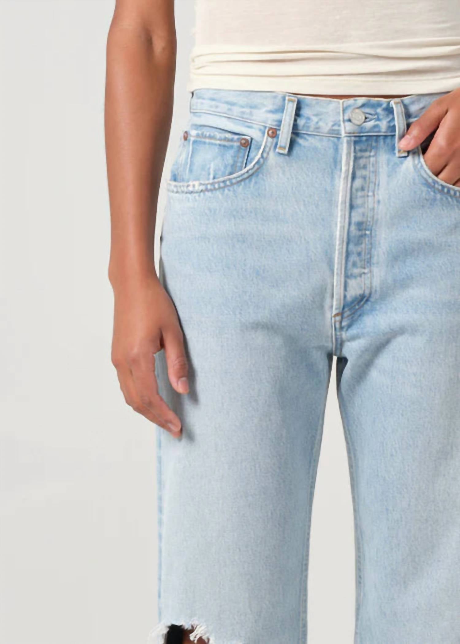 These must-have jeans are fit to perfection. Elevate your denim collection with the 90's Crop Loose Straight Jeans by AGOLDE, a timeless piece in light pale indigo Segment wash with a chic distressed knee. Designed with a 12.5" high rise and relaxed fit, these jeans feature a button closure and a cropped 26" inseam that pairs effortlessly with any outfit. Made from 100% regenerative cotton, they promise a soft feel and enduring quality. Care for them easily with machine wash cold, and tumble dry low. Model is 5'10" and wears a size 27, showing off the classic 15.75" leg opening.
