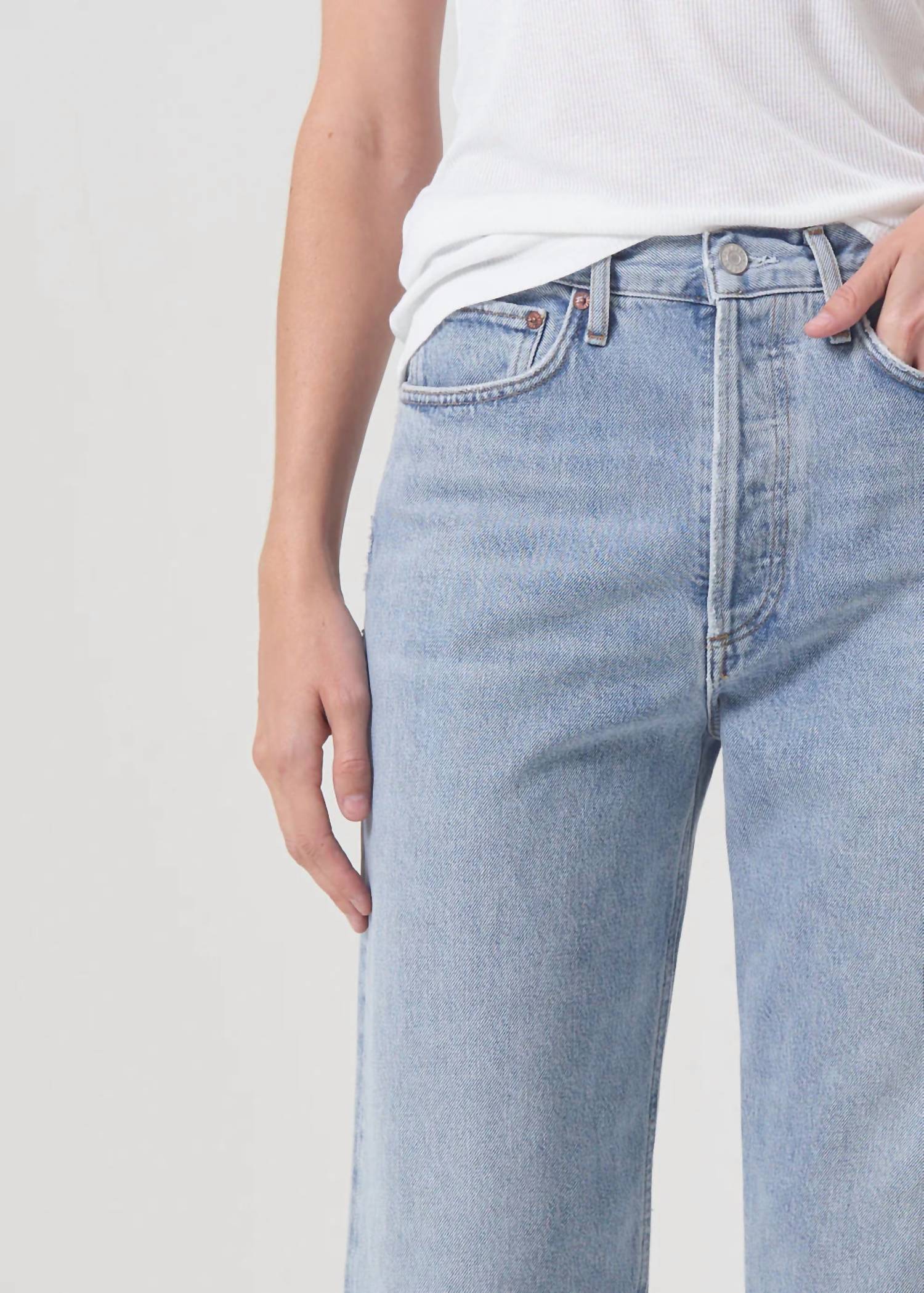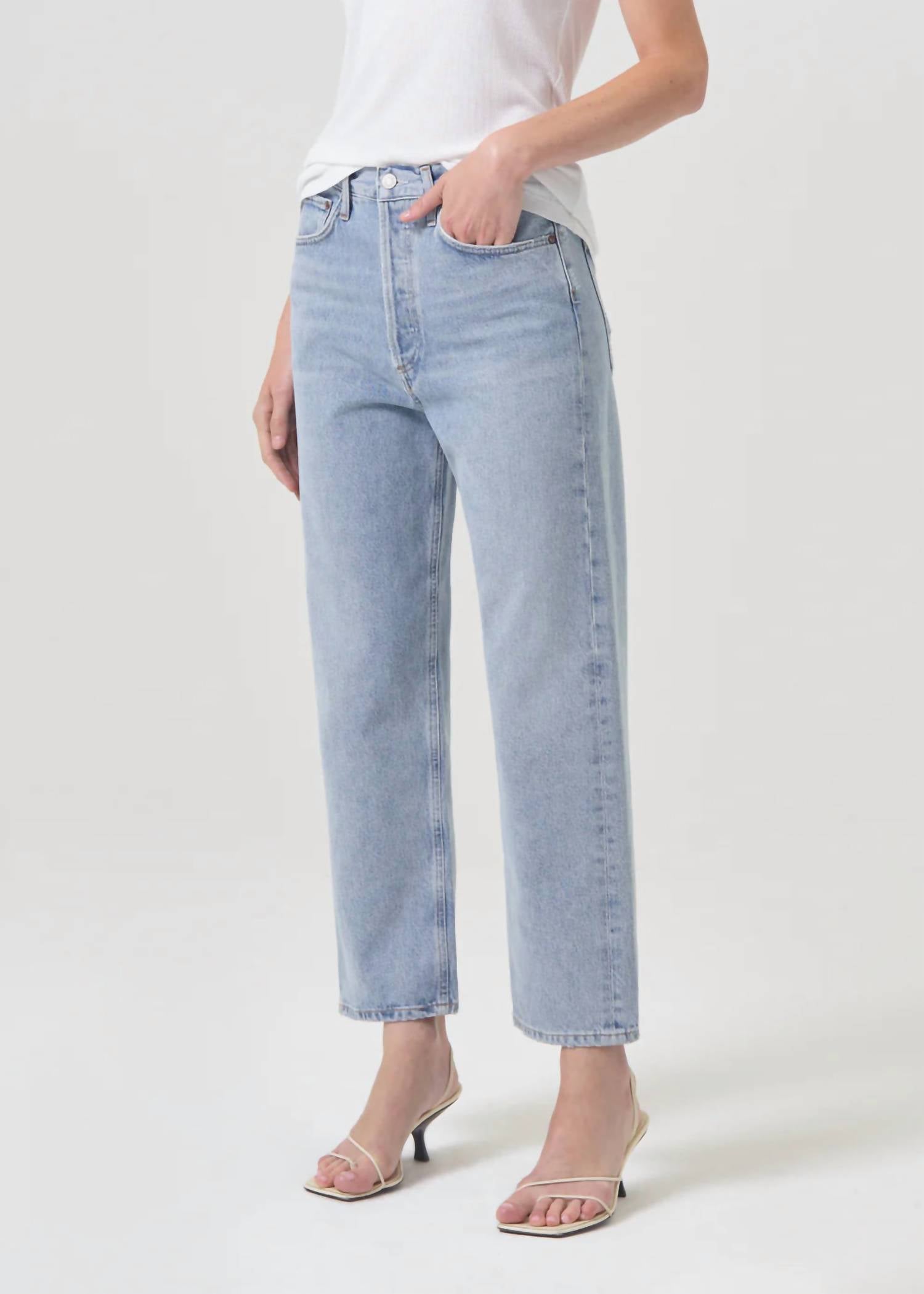 The perfect cropped jean for those transitional seasons. Introducing the AGOLDE 90's Mid Rise Crop Pant, the ultimate versatile piece for your spring streetwear collection. This medium wash denim features a solid pattern in the color Replica, with a relaxed fit and straight leg for effortless style. Designed with a mid-rise waist and button closure, these cropped pants offer a classic 90s-inspired silhouette. Perfect for any concert occasion, they come with functional pockets for added convenience.