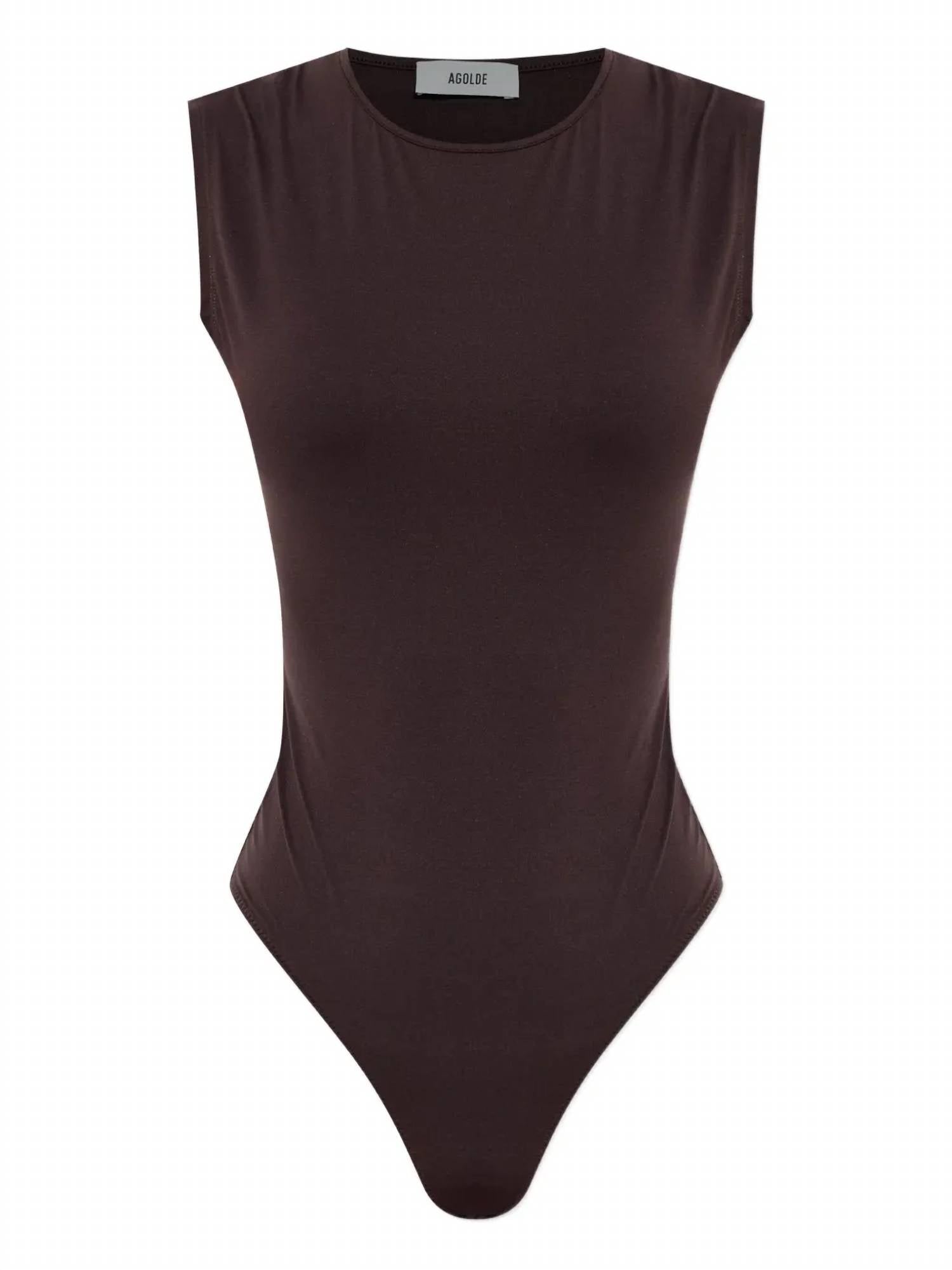 Form fitting and comfortable - this bodysuit check all of the boxes. Meet the Aura Sleeveless Bodysuit by AGOLDE, an essential piece for any wardrobe in a rich chocolate brown. This bodysuit features a classic crewneck and tonal stitching, embodying a seamless, monochrome look. Made in a blend of 73% Polyamide and 27% Elastane, it offers a snug fit while being easy to wear with a pull-on closure. Care for this piece by machine washing and line drying as needed.