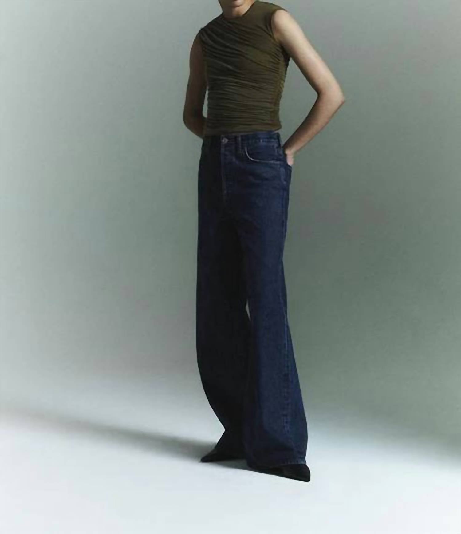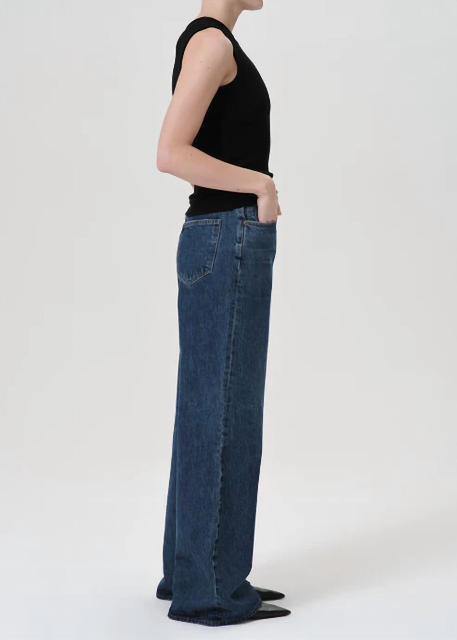 High-waist is here to stay and we especially love this style. Introducing the Dame High Rise Wide Leg Jeans by AGOLDE in the rich hue of No Cuff Enamour. These jeans feature a flattering 12 1/2" high-rise waist with a button fly closure, offering a relaxed fit that flows effortlessly into a wide 25" leg opening. Crafted from 100% regenerative cotton denim, they showcase a clean dark vintage indigo appearance with an authentic vintage feel. Care for these jeans is easy with machine wash cold, inside out, and tumble dry low instructions. Embrace timeless style with a nod to 90s fashion, perfectly suited for spring evening events.