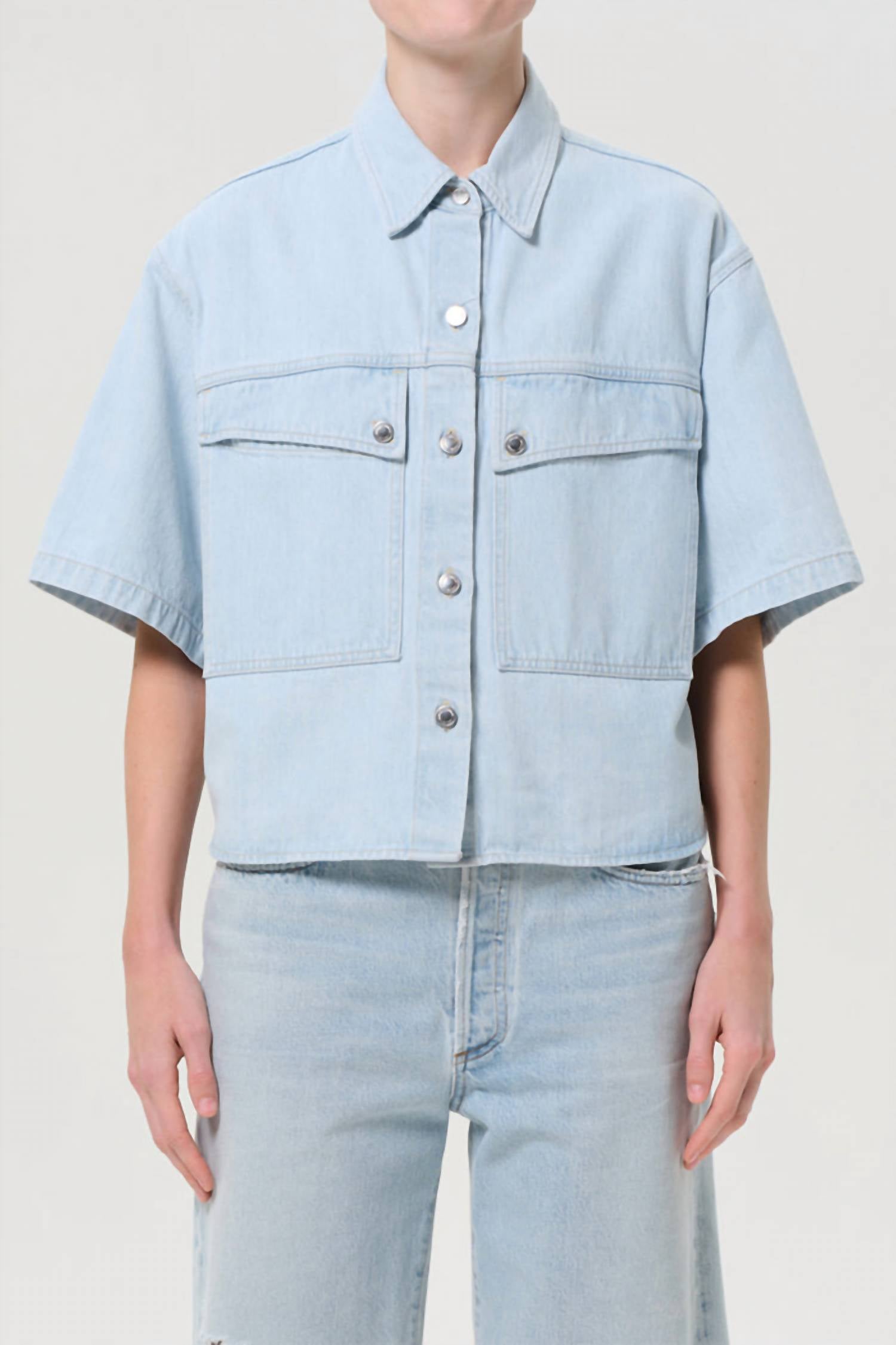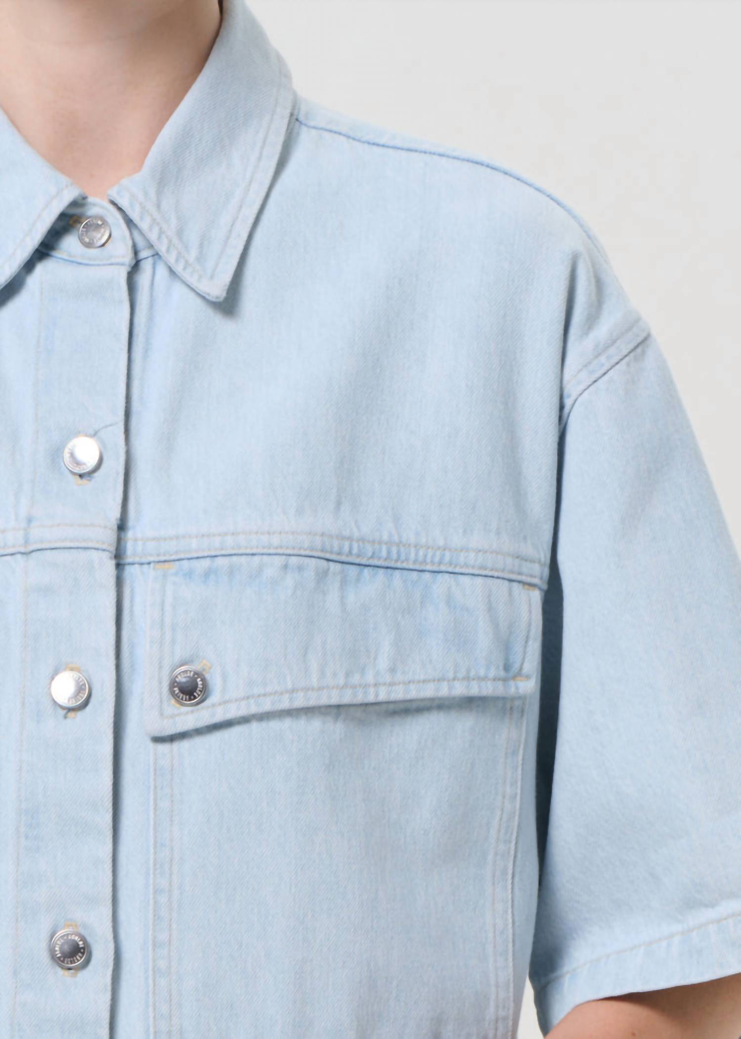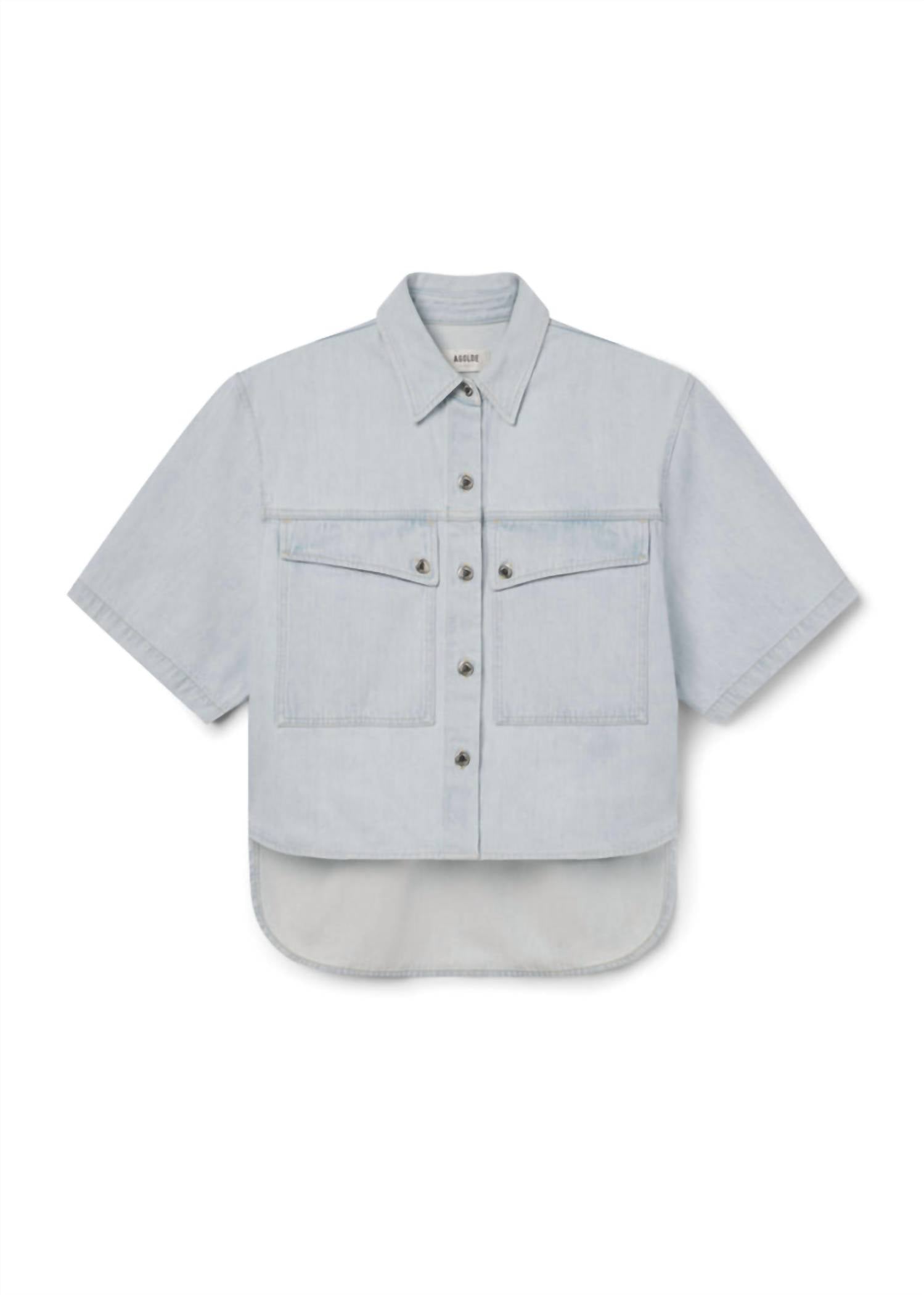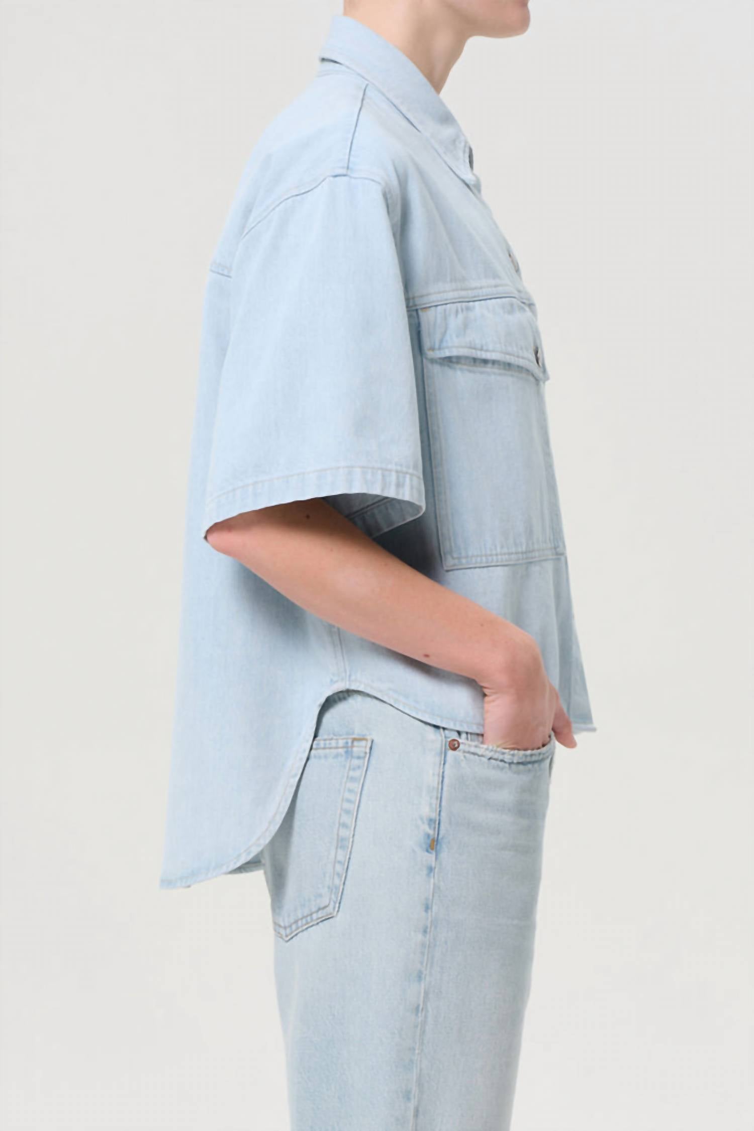 Perfectly tailored and soft to the touch. Introducing the Enora Shirt by AGOLDE, a statement piece in the Weightless Collection. This short-sleeve, oversized shirt is crafted from 100% regenerative cotton, offering a rigid yet soft feel. Designed with a boxy silhouette, large patch pockets, and an elongated back hem, it offers both style and functionality. Expertly crafted in Turkey, it features a convenient button closure and measures 23.75 inches in length. Care instructions recommend machine washing in cold water.