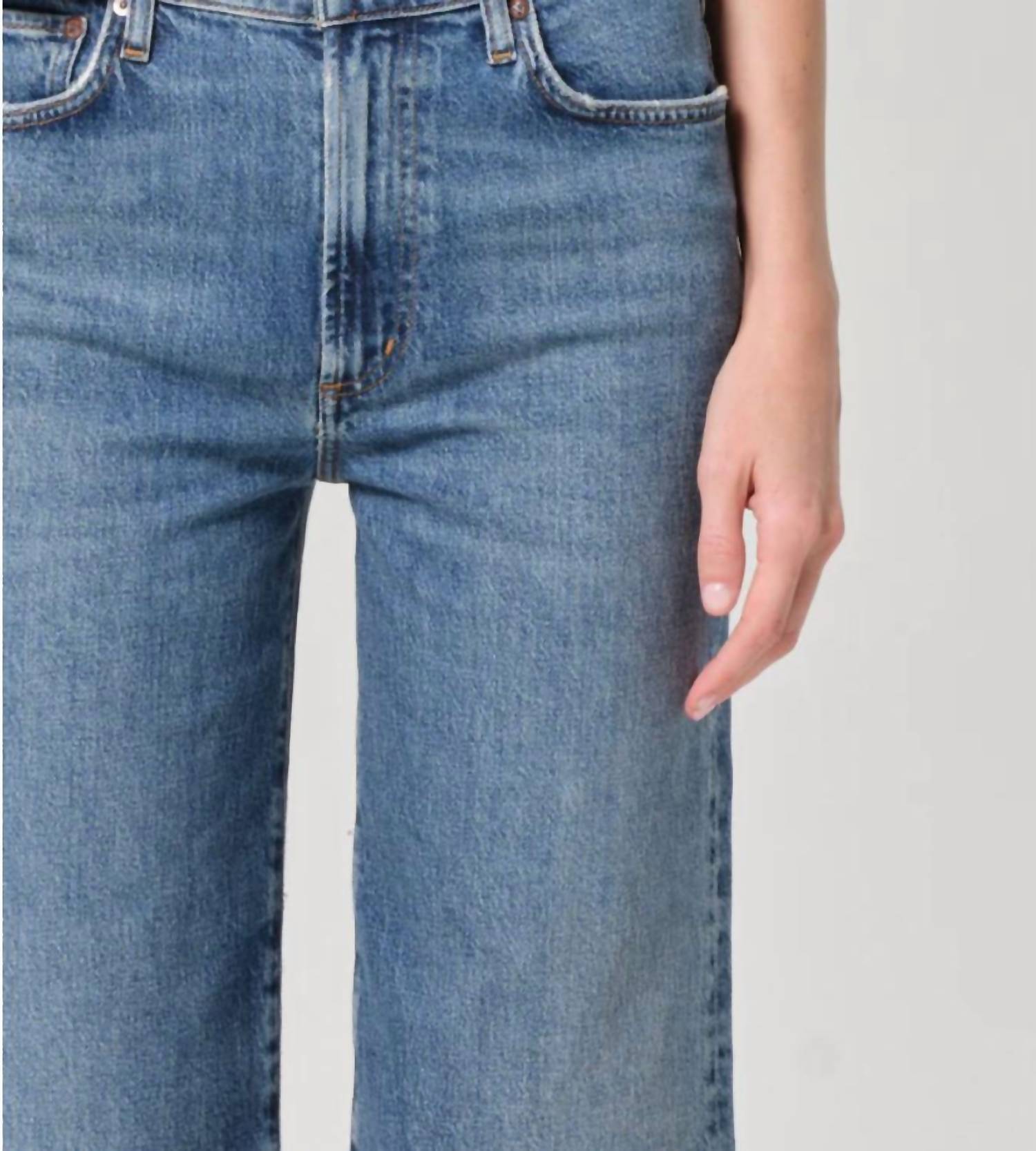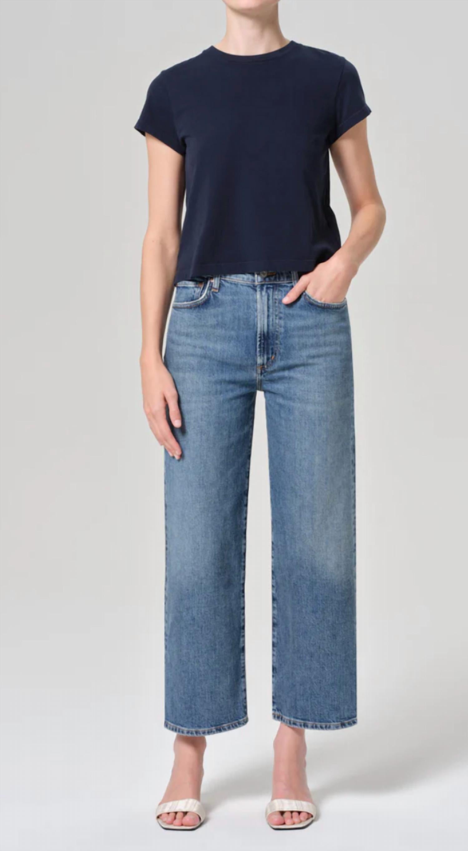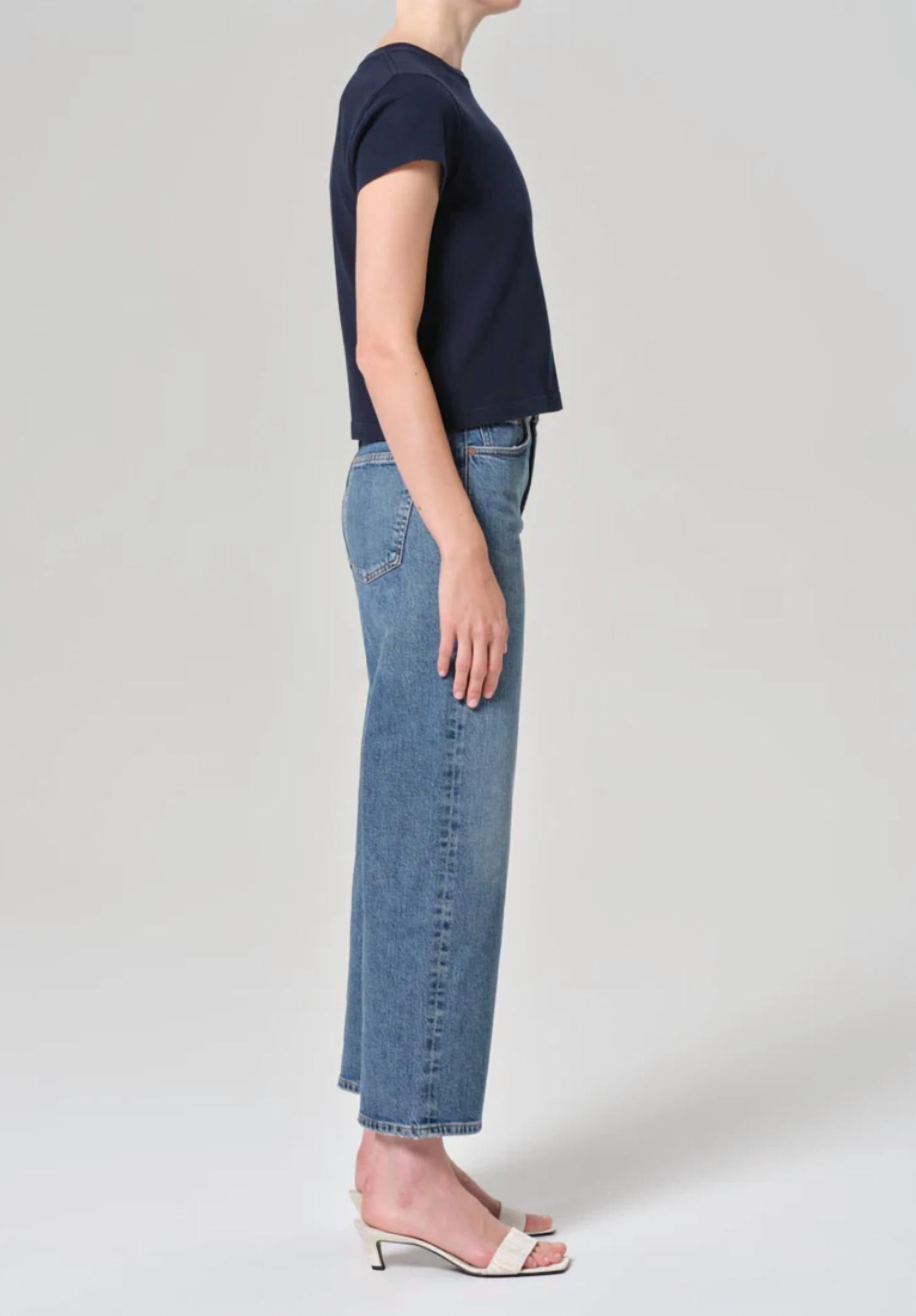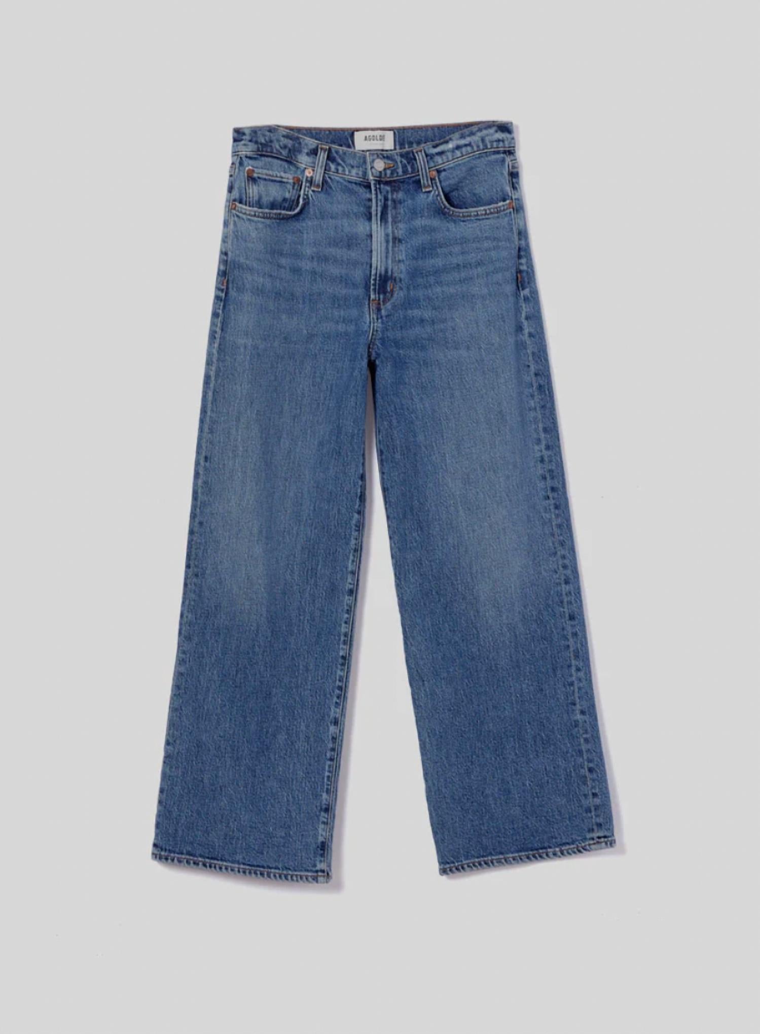 Pair these straight leg jeans with flats, sandals or even heels! You can't go wrong. The Harper Mid Rise Crop by AGOLDE in Moor is made from recycled cotton, offering comfort with a touch of stretch. These straight leg pants feature a flattering 11 1/4" rise and a 27" inseam for a subtly cropped look, with a button closure for ease of wear. The medium wash reflects a solid pattern, adding sophistication to your streetwear collection.