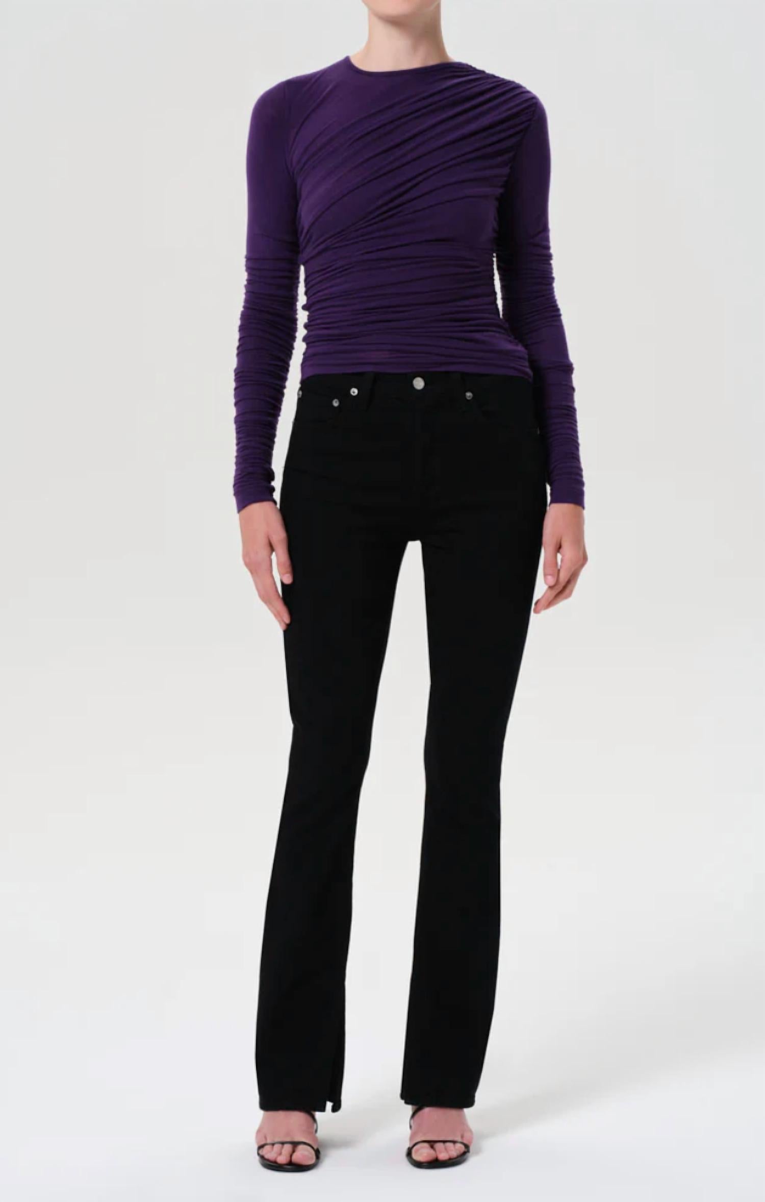 The perfect skinny jeans to wear with your favorite boots this season! Step into comfort and style with the Ingram Split High-rise Skinny Jeans by AGOLDE, crafted for the modern woman. These full-length jeans come in a solid Immersion color, offering a sleek skinny leg and a flattering high-rise waist. Made from lightweight, comfort stretch denim, they provide a super-soft feel and maintain their shape throughout the day. Closure type includes a zip closure for ease, and they are conveniently machine washable with tumble dry instructions, making them perfect for spring travels. Inseam: 29 inches.