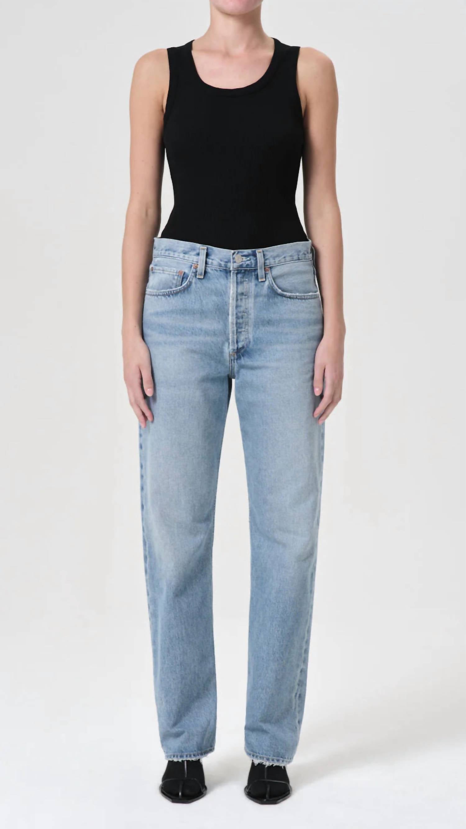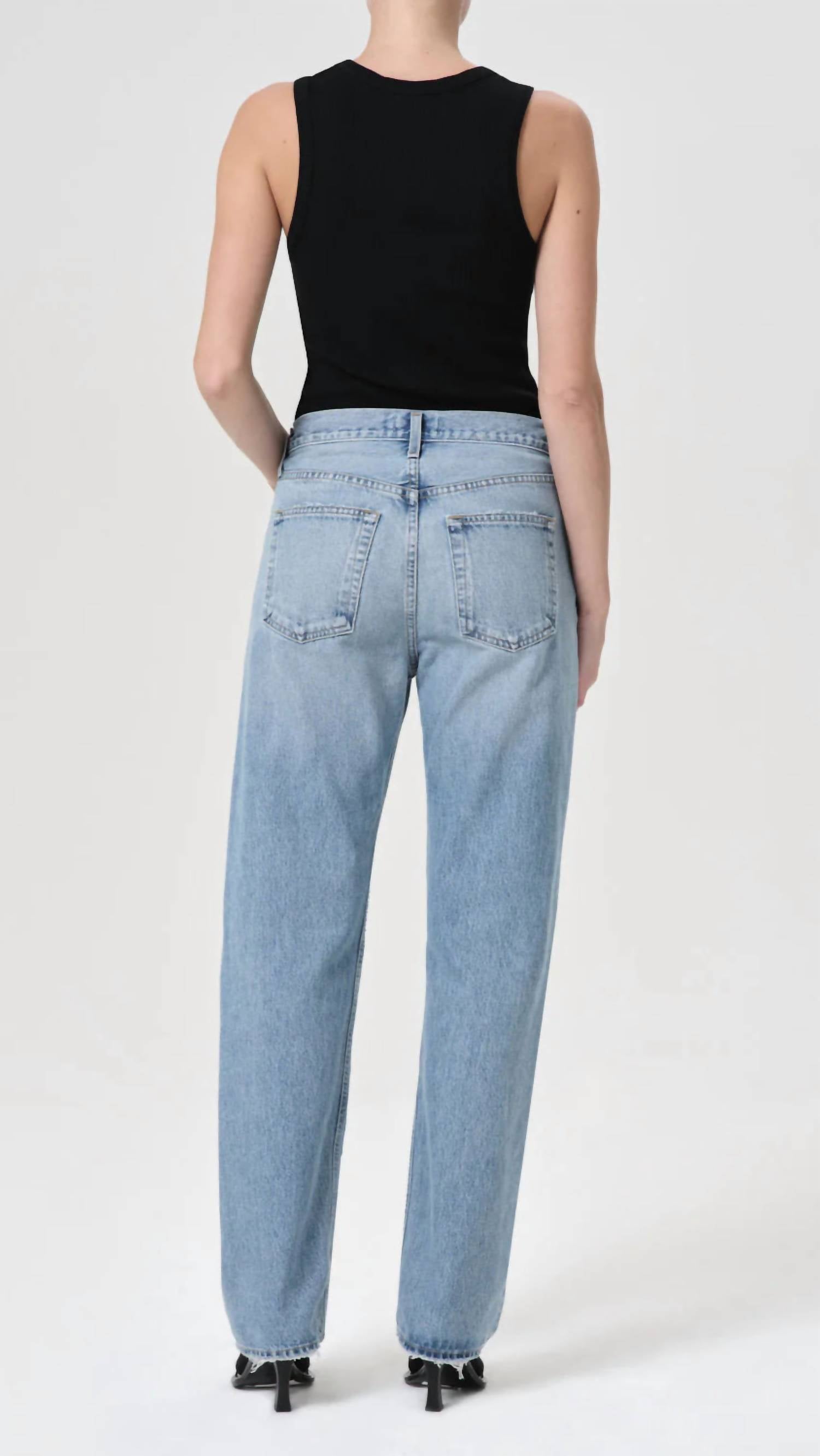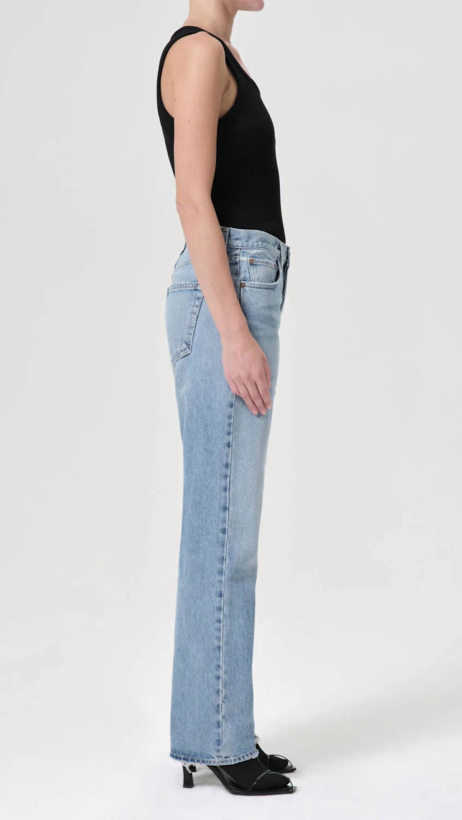 This classic straight leg jean has a perfect fit and goes with just about everything. Discover the AGOLDE Kelly Jean in the harmonic color, your must-have straight leg jeans of the season. With a high-rise waist that measures 11.25 inches and a relaxed top block, these jeans offer a comfortable fit and vintage-inspired extended inseam of 32 inches. Made from 100% regenerative cotton, they feature a solid pattern and button closure. Care for them easily with a machine wash in cold water, tumble dry low, and avoid bleach. Perfect for summer vacations, they embody a 90s fashion trend in a lightweight wash.