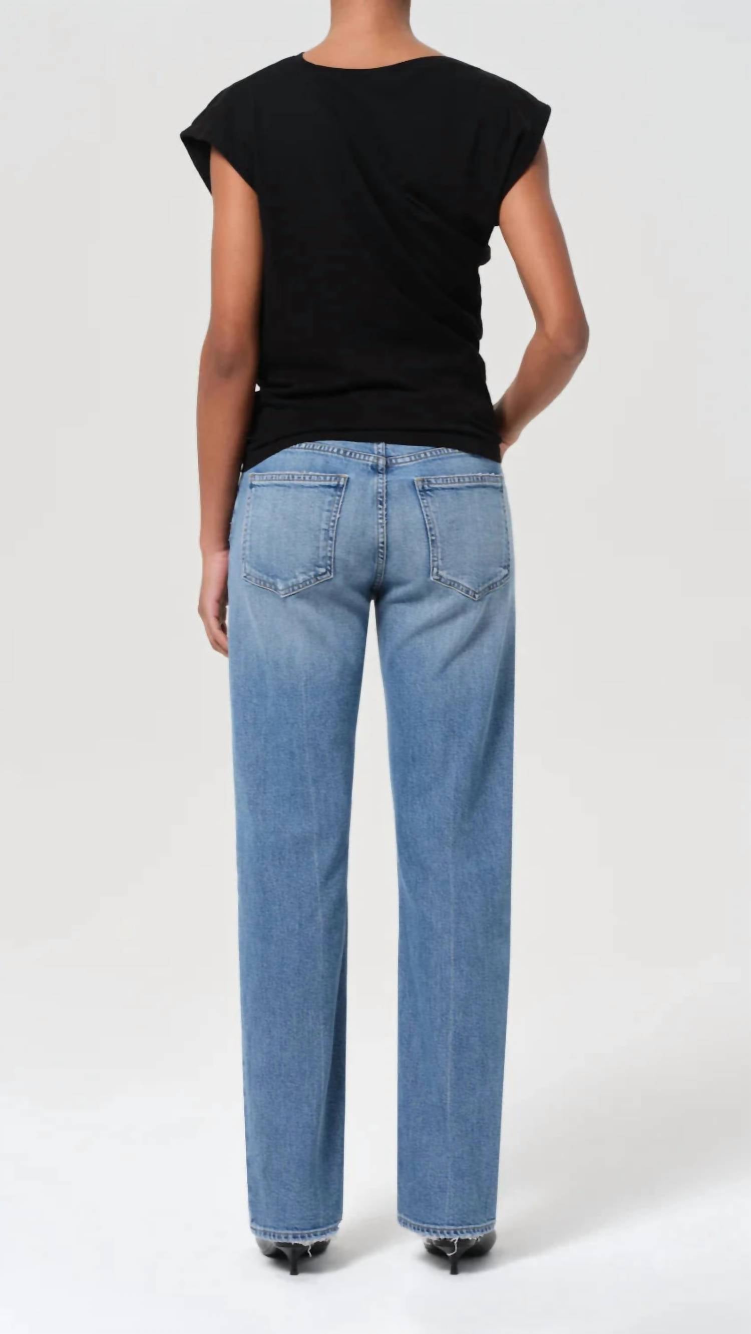 This classic straight leg jean has a perfect fit and goes with just about everything. Discover the Low Rise Slim Jeans by AGOLDE, an embodiment of comfort and style in Kindle with a nod to '90s fashion. These jeans feature a sleek high-rise fit with a 9 1/4" rise and 32" inseam, all in a straight leg style. Crafted from a blend of 99% regenerative cotton and 1% elastane, they offer a comfort stretch with a super soft hand. Closure: Zipper fly. Care: Machine wash cold inside out with like colors, do not bleach, tumble dry low. Model is wearing size 26 (5' 7 1/2" height, 34" bust, 26" waist, 37" hips).
