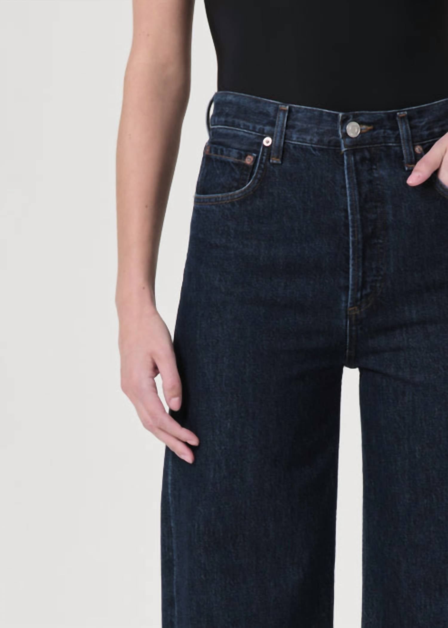Pair these wide leg jeans with mules, slides or your favorite strappy sandals. Meet the Ren High Rise Wide Leg Jean by AGOLDE, meticulously crafted for those who appreciate minimalist style. Featuring a high-rise waist and relaxed fit through the hips, this piece lends an elegant wide-leg silhouette. The jeans are made from 100% regenerative cotton with a polished dark indigo finish, providing a zero-stretch, soft feel. Closure: Button fly. Inseam: 27.5 inches, Leg Opening: 19.5 inches, Rise: 12.25 inches. Origin: Made in the USA with imported materials. Care: Machine wash cold inside out with like colors, do not bleach, tumble dry low. Model is 5'10" wearing a size 27.