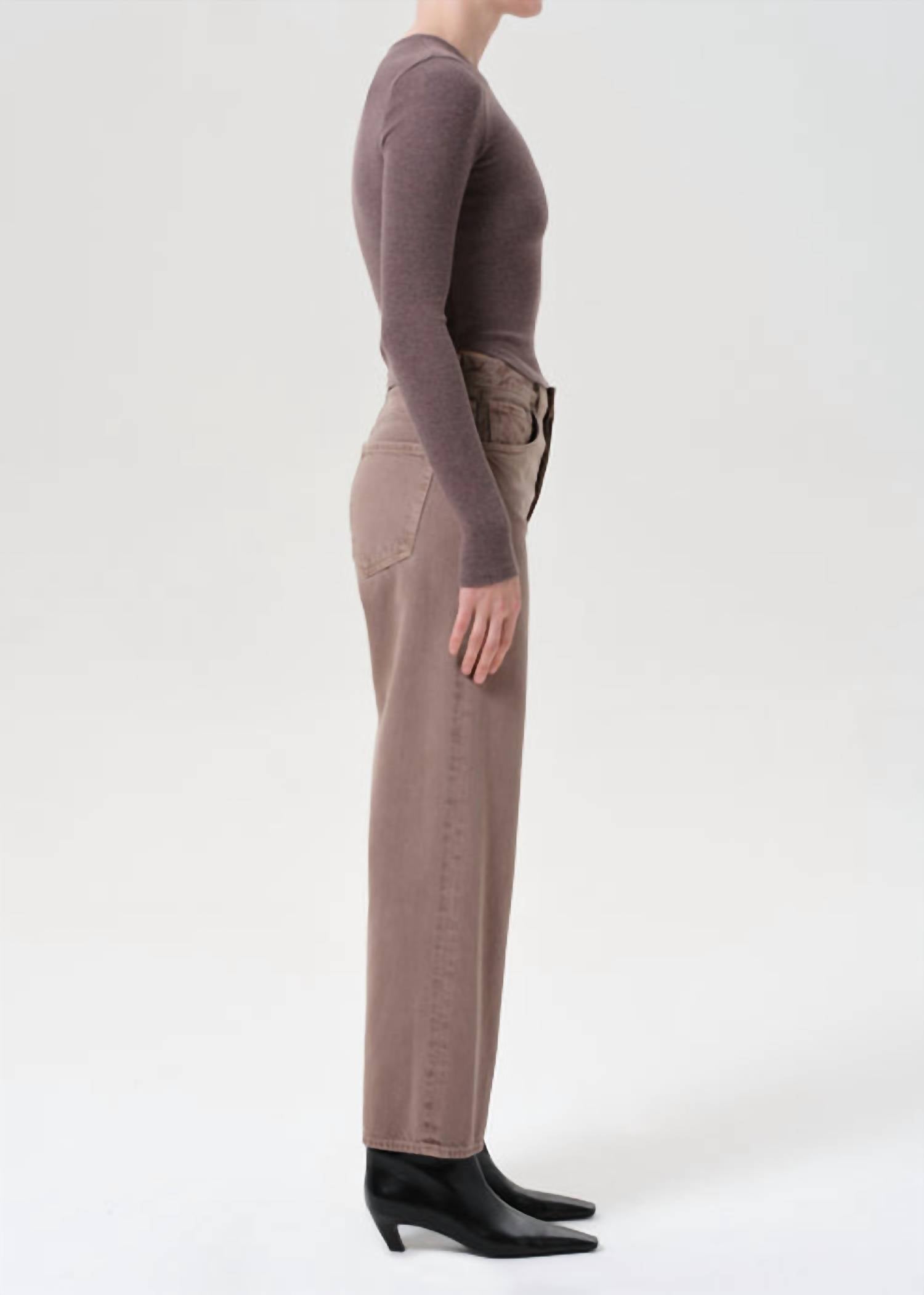 Just as cute as they are comfortable. Discover the Ren High Rise Wide Leg Jean by AGOLDE, a sophisticated addition to your wardrobe that elevates the classic wide-leg style. Crafted from 100% rigid regenerative cotton, these high-rise jeans in a ceramic dusty rose tone offer a relaxed fit with a 12.25-inch rise and a 27.5-inch inseam. Leg Opening: 19 1/2". Made in Turkey, they feature a button closure for a polished finish. For care, machine wash cold inside out with like colors and tumble dry low to maintain their luxurious feel. Model, standing at 5'10", wears a size 27.