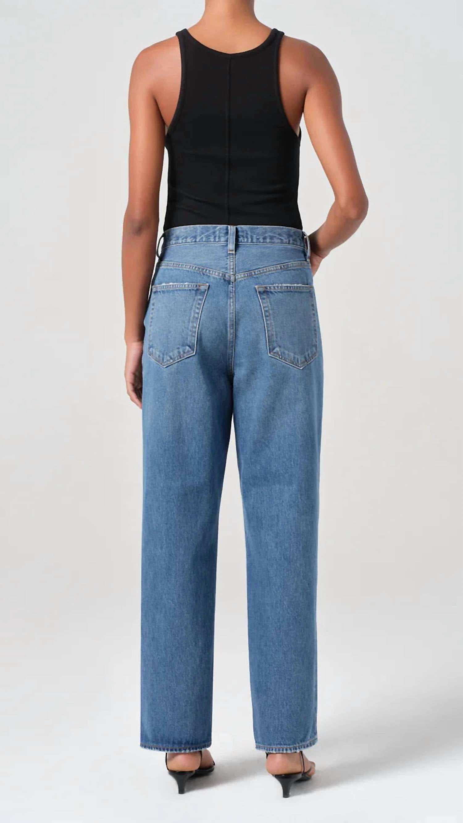 This classic straight leg jean has a perfect fit and goes with just about everything. Meet the V-waist Baggy Jeans by AGOLDE, a stylish piece perfect for a relaxed spring vacation look. These jeans boast a medium indigo wash with subtle fading and are made from 100% regenerative cotton that softens with wear. Featuring a V-front angled waistband, they have a zipper fly closure and practical pockets. With a 10.5" rise, 30" inseam, and 17" leg opening, they offer a wide, relaxed fit that embodies the 90s fashion trend. Care: Machine wash cold inside out with like colors, tumble dry low. Modeled in size 26, height 5' 7.5", bust 34.5", waist 29", hips 38".
