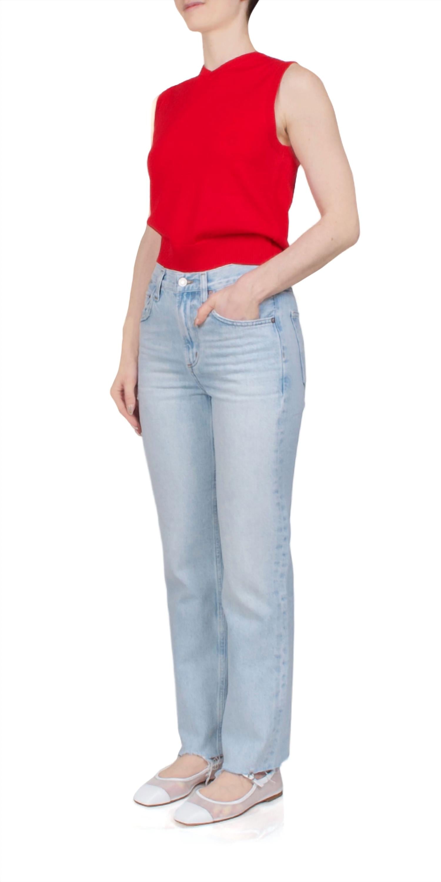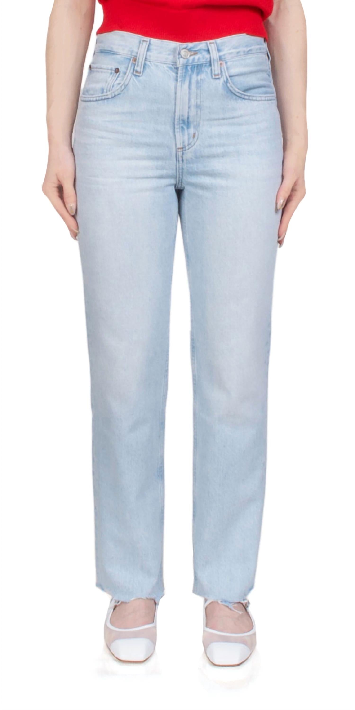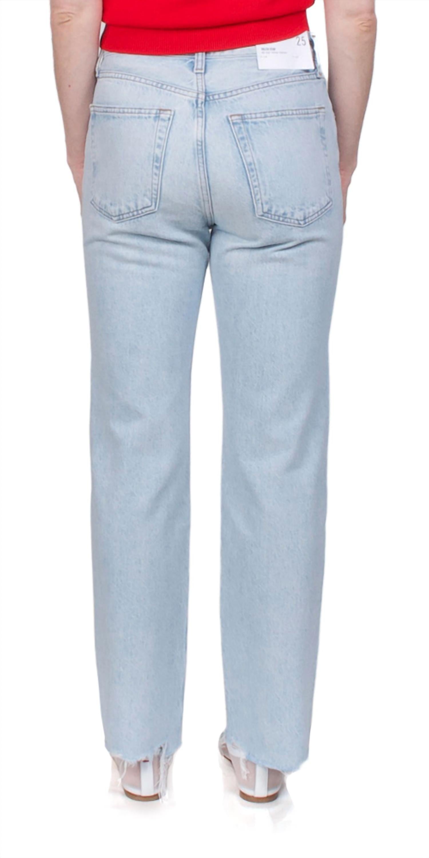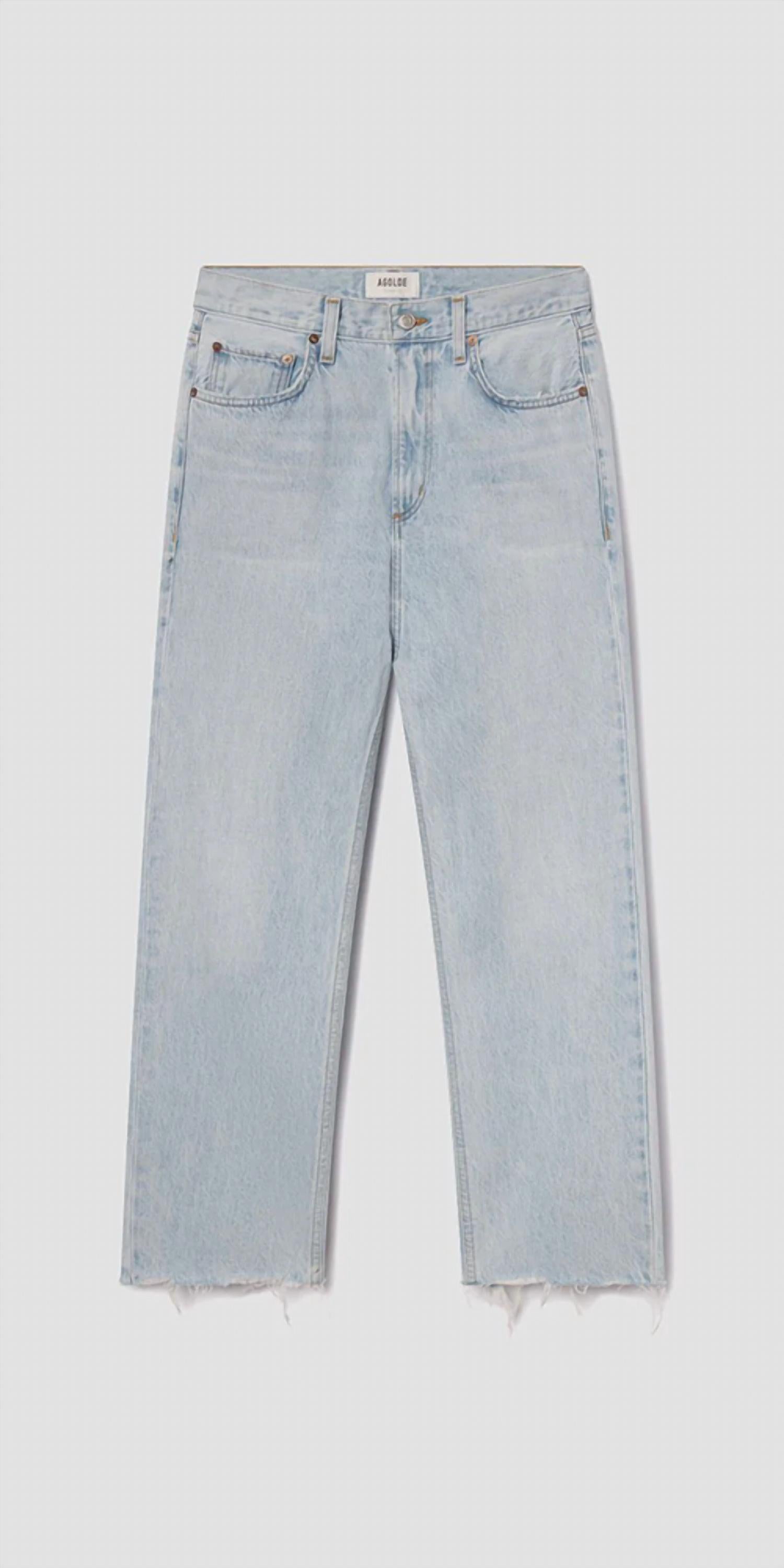 This classic straight leg jean has a perfect fit and goes with just about everything. Introducing the Valen Jean Dual by AGOLDE, meticulously crafted for timeless style with a mid-rise and straight leg fit. Made from 100% regenerative cotton, these jeans feature a non-stretch, structured fit with a soft, lived-in feel. The light pale indigo denim showcases fading and whiskering for a vintage appeal, completed with a raw edge hem for added character. Closure is via a zipper fly, offering a practical wear, with a rise of 11", inseam of 28 1/2", and a leg opening of 15". Model is 5ft 5in and wears a size 25.