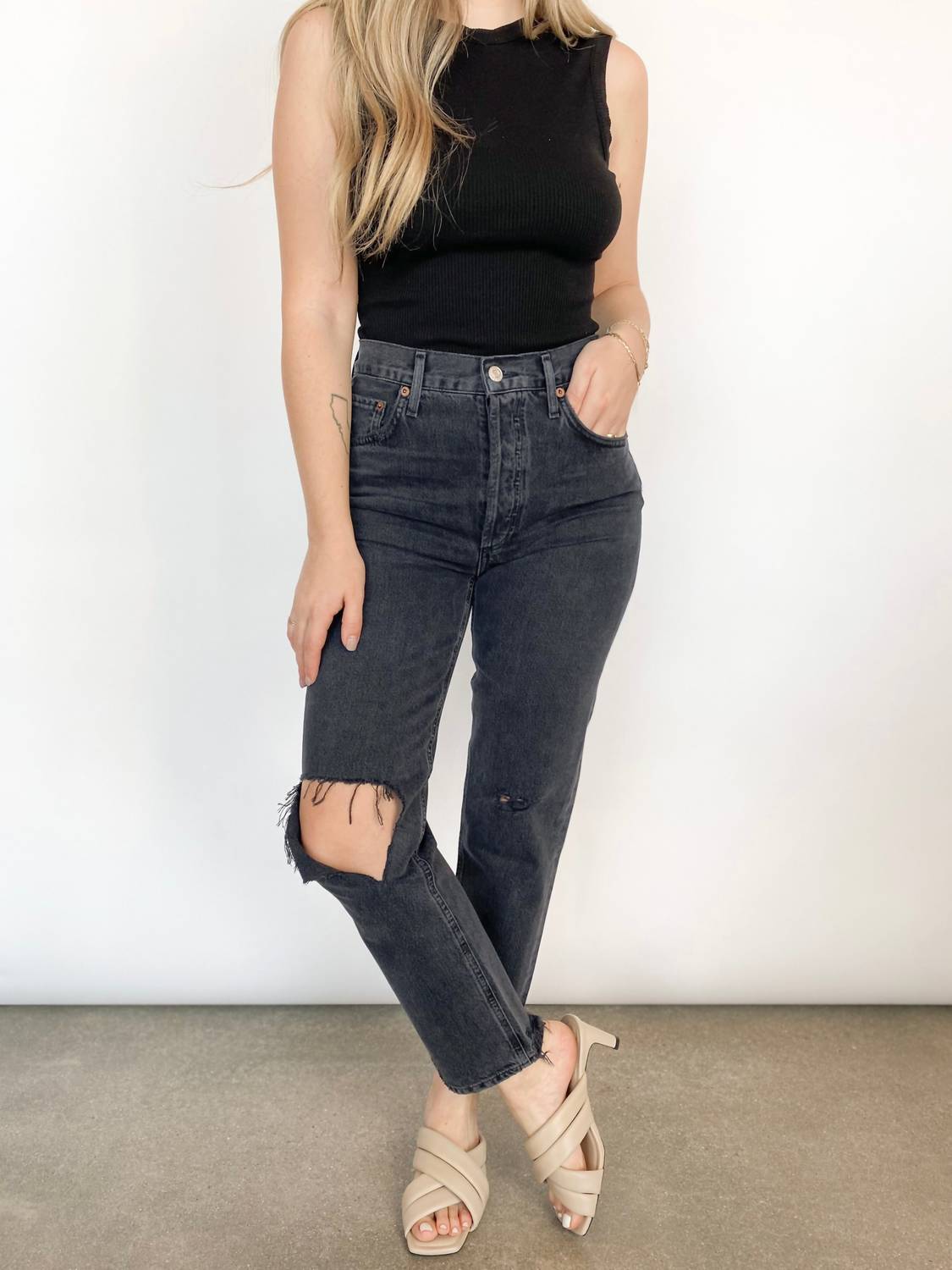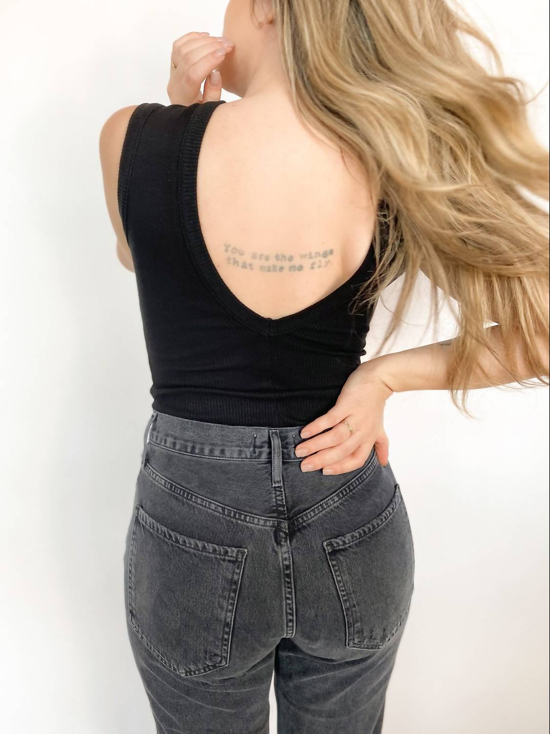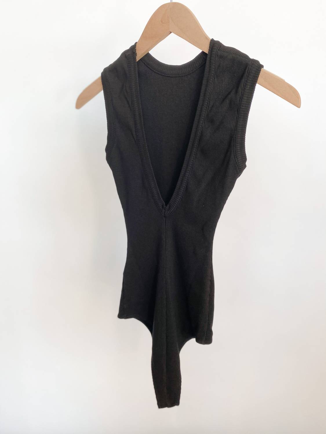 Form fitting and comfortable - this bodysuit check all of the boxes. Dive into effortless style with the Women's Sutton V Back Bodysuit by AGOLDE, expertly crafted for modern comfort and versatility. This sleeveless bodysuit combines a rich blend of 49% organic cotton, 49% Tencel Lyocell, and 2% spandex, offering a soft and stretchy feel. Designed in a reversible pattern, it features a ribbed fabric with options to style with a high neck or a deep V plunge neckline. Made in the USA, it ensures easy maintenance with machine wash cold, inside out, with like colors, and a tumble dry low.
