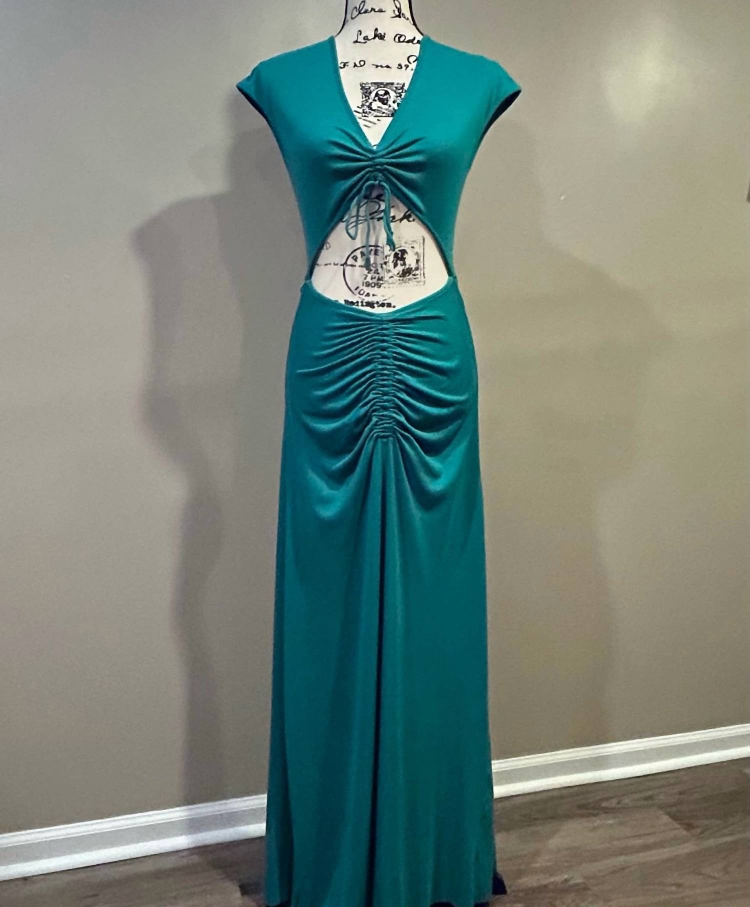 Who doesn't love a good maxi dress? This one you'll be reaching for season after season. The Agua Bendita Ailana Tile Dress is a standout piece crafted for effortless elegance and vacation vibes. Designed in a solid green hue, this maxi dress showcases cap sleeves and a captivating cut-out midriff with an open back. Made from a blend of 96% Polyester and 4% Spandex, it measures 43" from the high point of the shoulder and features a comfortable pull-on closure with a V-neckline. Handmade details enhance its charm, and it requires hand washing and line drying for care.