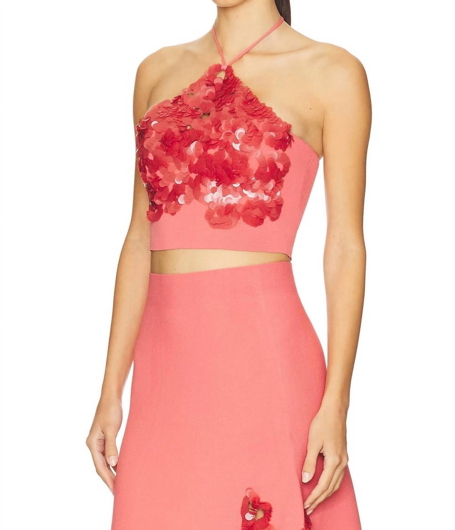 Pair this crop top with your favorite high-waisted jeans or maxi skirt. Indulge in the quiet luxury of the ALEXIS Relle Halter Sequin Top, an exquisite choice for cocktail parties and Valentine's Day celebrations. This strapless, textured crop top in vibrant pink features a striking knit halter design with glamorous sequin detailing, embodying elegance and sophistication. Closure: Pull on. Care: Dry clean and lay flat to dry.
