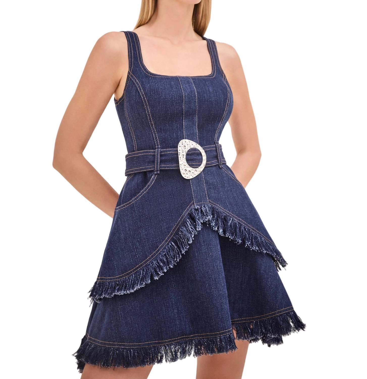 Cute and comfortable, this long sleeve dress has it all. Introducing the Macey Dress in Denim by Alexis, designed for those who appreciate both style and sophistication. This fit and flare mini dress is sleeveless, boasting a flattering squareneck that elegantly frames your neckline. Crafted from a cotton blend composed of 63% cotton, 20% wool, 15% polyester, and 5% elastane, it's perfect for a summer dinner party or a New Year's Eve celebration. Imported with a zip closure, it features practical pockets and is easy to care for with machine wash instructions.
