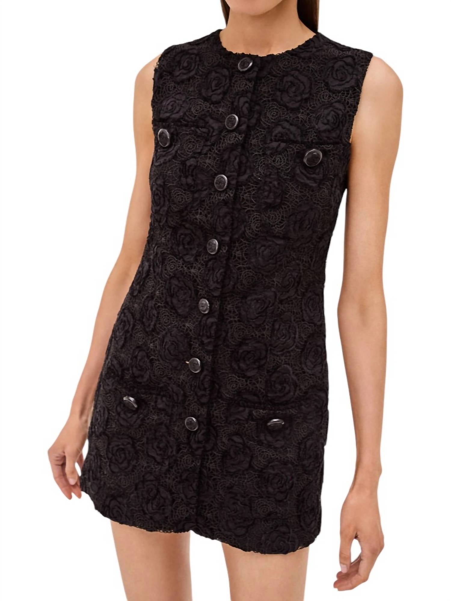 This mini A-line dress is crafted from eye-catching lace, featuring a high crew neckline and side pockets. It has simple tailored details with a button front that can be left open or closed for a versatile look.