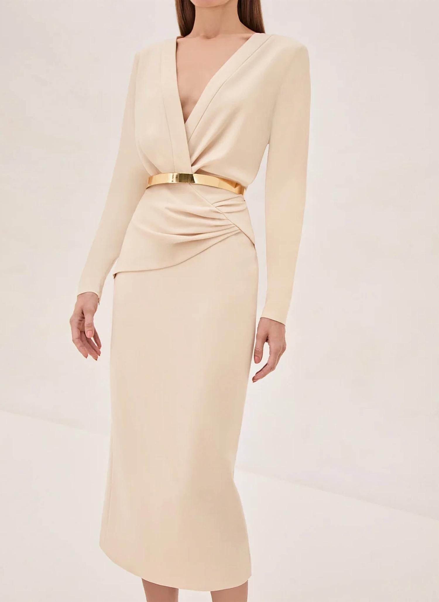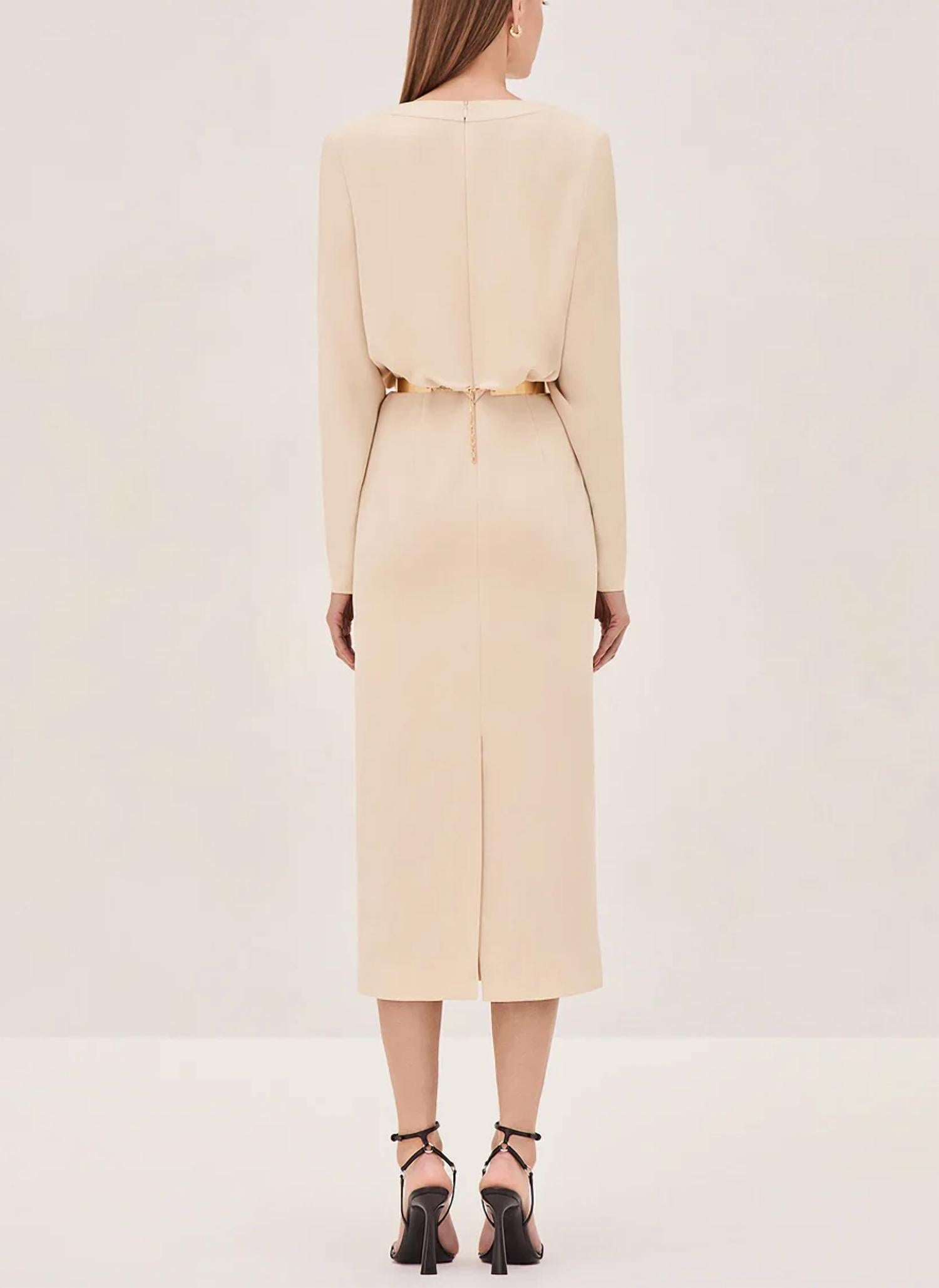 The perfect length dress does exist. Introducing the Fraser Midi Dress by ALEXIS, a sophisticated choice in elegant cream. This dress features long sleeves and is crafted from polyester with elastane for a comfortable fit. Designed with a wrap silhouette and a surplice V-neckline, it falls below the knee and boasts an invisible back zip for seamless wear. Imported and lined with polyester, it requires dry cleaning for optimal care.