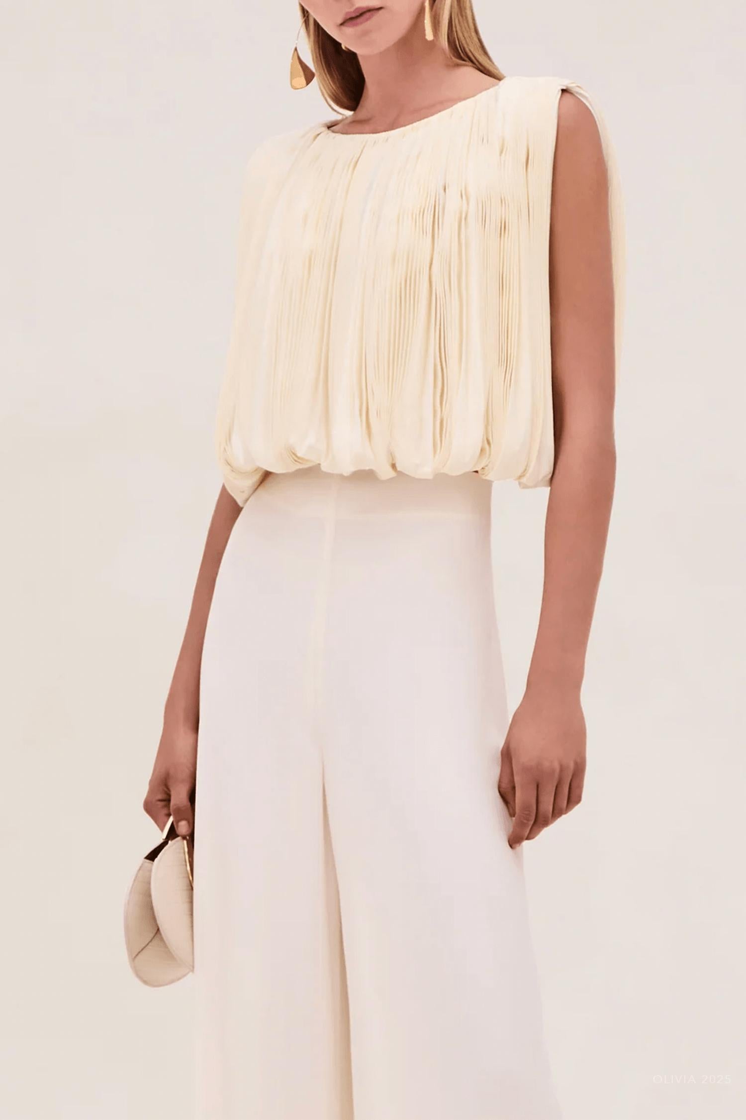 Pair this with your favorite jeans and slides for your next girls night out. Unveiling the Dorett Sleeveless Top by ALEXIS, a sophisticated piece in an elegant ivory hue. Crafted entirely from pleated georgette, this top showcases a bubble silhouette with an elastic hem for a modern touch. Imported and designed with a keyhole cutout and back button closure, it promises both style and comfort. For optimal care, dry clean only. 100% Polyester.