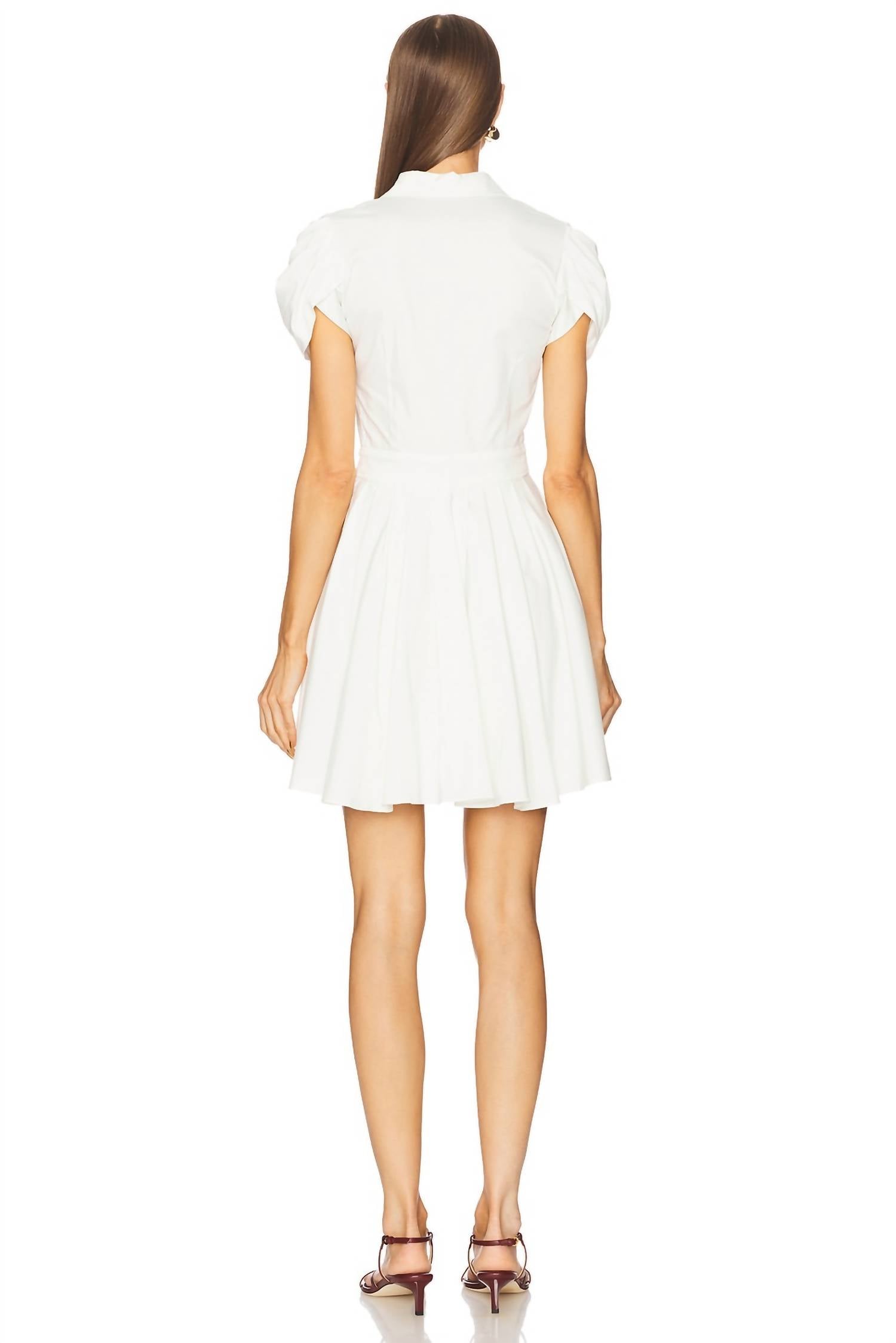 A short and breezy dress for those warmer days. Introducing the April Dress by ALEXIS, a chic cotton poplin mini dress perfect for your summer wardrobe. It features short ruched puff sleeves and a tailored button-down bodice that seamlessly transitions into a pleated A-line skirt. The dress is composed of 53% cotton, 43% viscose, and 4% elastane, ensuring a comfortable fit. Made in China with a button closure, it requires dry clean care to maintain its crisp, minimalist appeal.