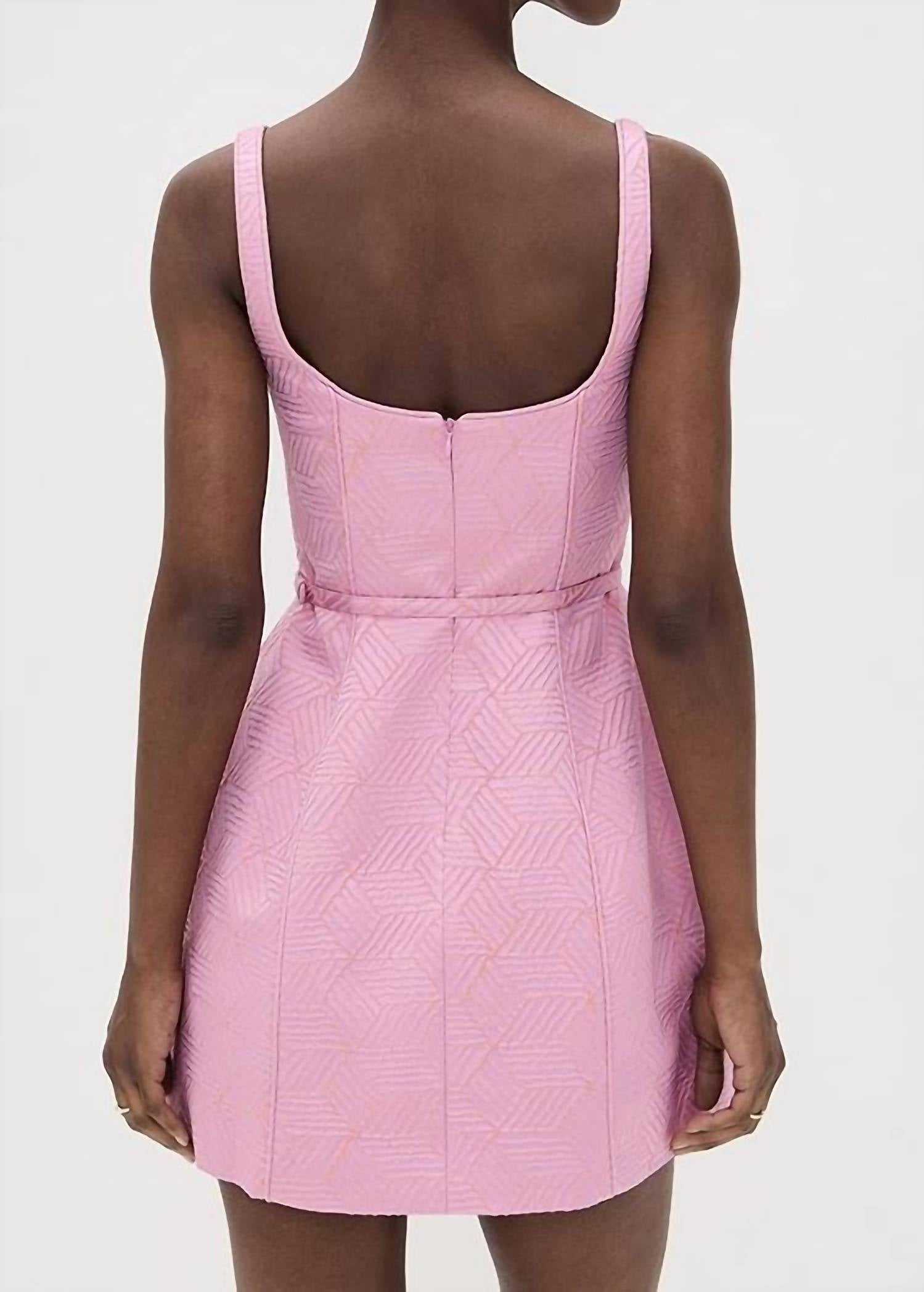 The kind of easy and flattering dress you'll be reaching for all season long. Introducing the Bijoux Dress by ALEXIS, a stunning mini dress in the captivating shade of Rose Illusion. This sleeveless piece is crafted from a mid-weight, non-stretch jacquard weave featuring a textured geometric pattern. Composition includes 97% Polyester and 3% Polyamide, with a 95% Polyester and 5% Elastane lining for added comfort. Closure is achieved with a hook-and-eye and hidden zip at the back, complemented by a self-belt at the waist. Garment Length: 30 inches. Care: Dry clean only. Ideal for holiday party occasions, this dress embodies the essence of quiet luxury with its sophisticated A-line silhouette and elegant square neckline.
