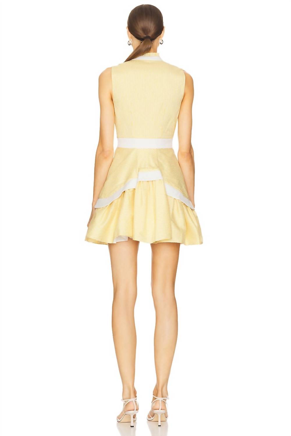 A short and breezy dress for those warmer days. Embrace the minimalist charm of the ALEXIS Natacha Dress, perfect for a summer holiday party with its vibrant Yellow Stripes. This sleeveless mini dress showcases a high neck and A-line silhouette, crafted from medium-weight seersucker fabric for a structured yet breezy fit. The composition includes a body blend of 97% polyester and 3% elastane, complemented by a 100% cotton lining and contrast fabric that integrates 57% cotton, 40% polyester, and 3% elastane. Closure: Front button closure. Care: Dry clean only.