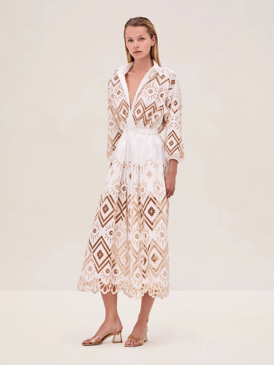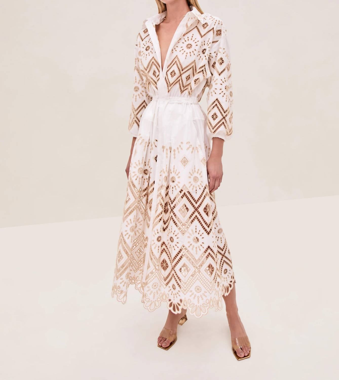 Just add slides or mules and you are good to go. Introducing the Portello Midi Dress by ALEXIS, a delightful piece in crisp white cotton with eyelet detailing, perfect for sunny days. Designed with long sleeves and a flattering drawstring waist, this A-line silhouette offers both style and comfort. Crafted from 100% Polyester, it features a practical button closure and side pockets for added convenience. Care instructions: Dry clean only.
