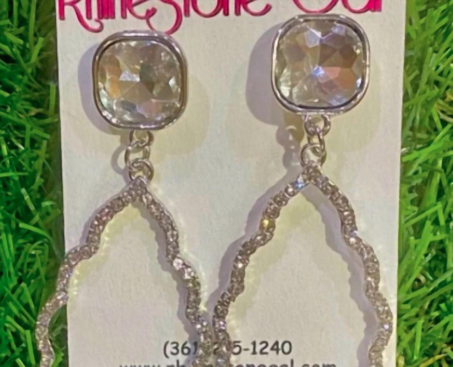 Easy and elegant earrings to complement any outfit. Presenting the Women's Clear Crystal Rhinestone Drop Earrings by MiMi Wholesale, a captivating addition to any jewelry collection. These earrings feature a faceted iridescent crystal post, elegantly paired with a rhinestone-lined abstract silhouette in stunning silver plating. Expertly designed for both comfort and glamour, they make an ideal choice for weddings, date nights, or any special event in need of extra sparkle. Approximate length is 2 ¾ inches.