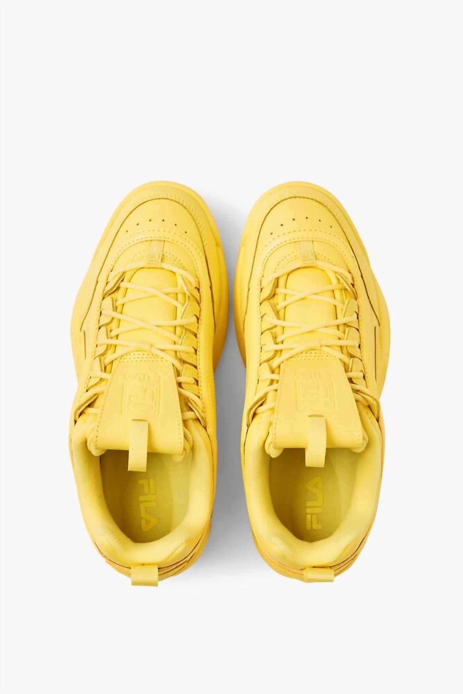 When fashion and function come together seamlessly. Step up your style with the Women's Disruptor II Chunky Sneaker by FILA, a standout accessory in a striking Gold Finch hue. These sneakers, designed for adult women, offer a perfect balance between pastel and primary yellows, making them ideal for springtime fashion. Crafted with vegan leather and featuring a chunky rubber sole, they promise both style and sustainability. The sneaker fits true to size and boasts a round toe shape for added comfort.