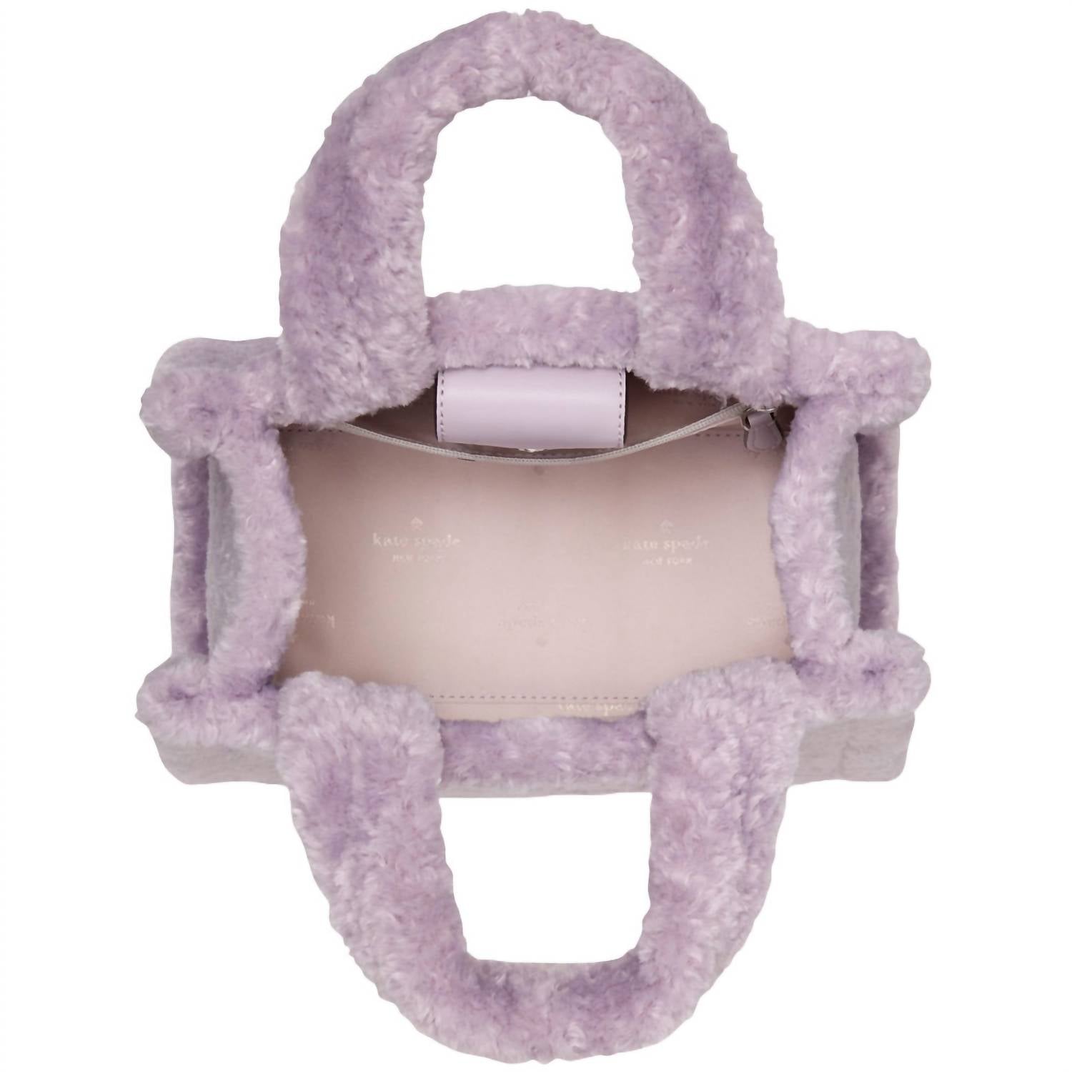 The carry-all tote bag of the season. Get in vacation mode with this perfectly sized tote bag that is the perfect accessory for beach days, pool parties, or sunset dinners. Introducing the Ellie Small Faux Fur Tote Bag by Kate Spade, a chic accessory in a striking Violet Mist hue. Crafted from luxurious faux fur, this tote measures 8.2" in height, with a bottom width of 9.36" and a top width of 8.88". It features a magnetic snap closure for security and an interior back zip pocket for added convenience. The handle has a length of 5", and the strap extends to 22" for versatile carry options. An embroidered logo and two-way script logo lining add a touch of sophistication.
