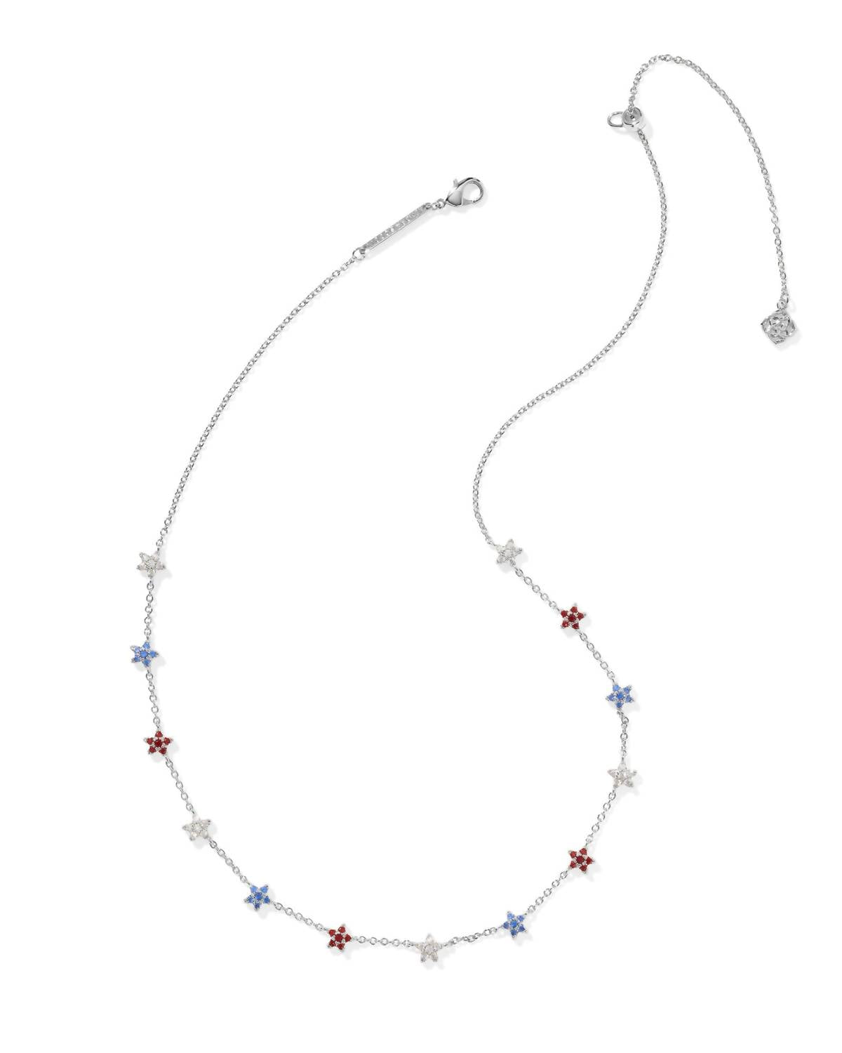 Both understated and impactful, you'll be reaching for this one-of-a-kind necklace season after season. Elevate your layered look with the Women's Sierra Star Strand Necklace by Kendra Scott, featuring radiant star shapes on a delicate chain. Composed of Rhodium Over Brass, this necklace is adorned with red crystal, white CZ, and blue crystal for a playful sparkle. It measures 19" in length with a width of 0.34", and it secures with a lobster clasp complemented by a single adjustable slider bead. A fine piece in hues of red, white, blue, and silver, this necklace is perfect for versatile styling.