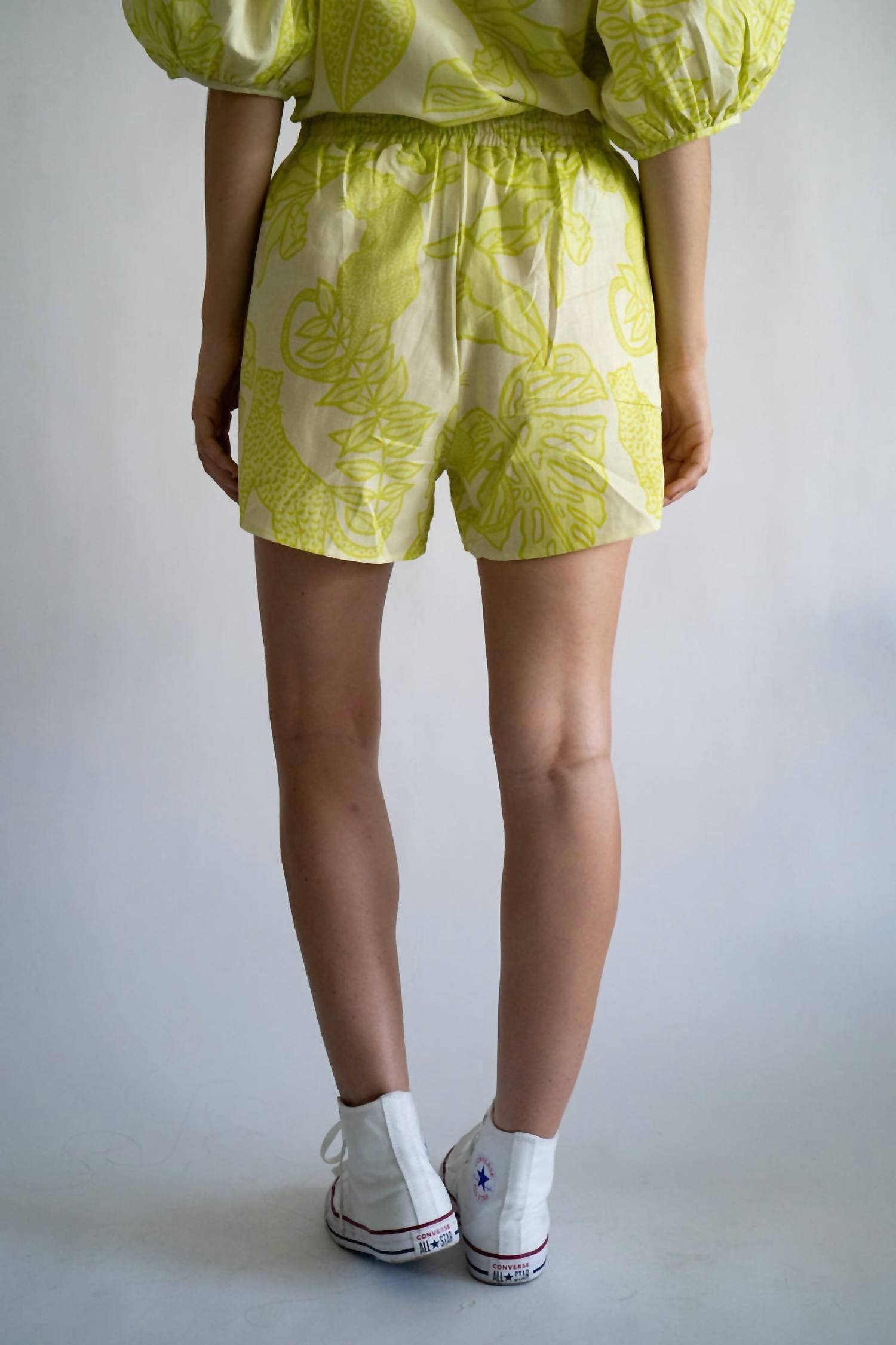 A set so cute you'll never want to take it off. Designed to look good while lounging, this little number is the perfect outfit for hanging at home in style. Introducing the Short Life In Colors Set by Las Sureñas, a vibrant and stylish choice perfect for your summer wardrobe. These high-rise shorts, made from a blend of 55% linen and 45% cotton, offer a comfortable fit with an elastic waist and side seam pockets, ideal for any casual outing. This patterned set in a striking lime shade features a straight hem that pairs perfectly with its matching tops, allowing you to create a standout total print look. Care: Machine wash.