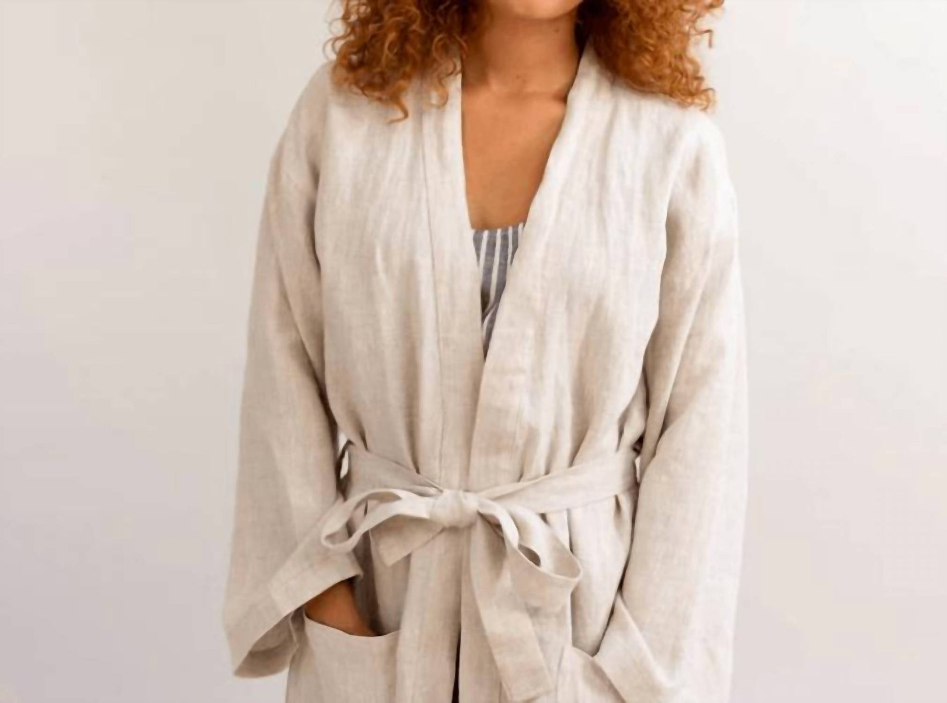 The perfect piece to lounge in, sleep in, and cook breakfast in. Embrace comfort and elegance with the Linen Drawstring Robe by Piglet in Bed, crafted in a soothing oatmeal hue. This women’s robe features long sleeves and is composed of 100% natural stonewashed flax, ensuring comfort throughout the seasons. Designed with practical details like a drawstring closure and two large pockets, it showcases a relaxed, oversized silhouette for that minimalist, effortless look. Care is simple with machine washing, while ironing is optional to maintain its charming crumpled texture.