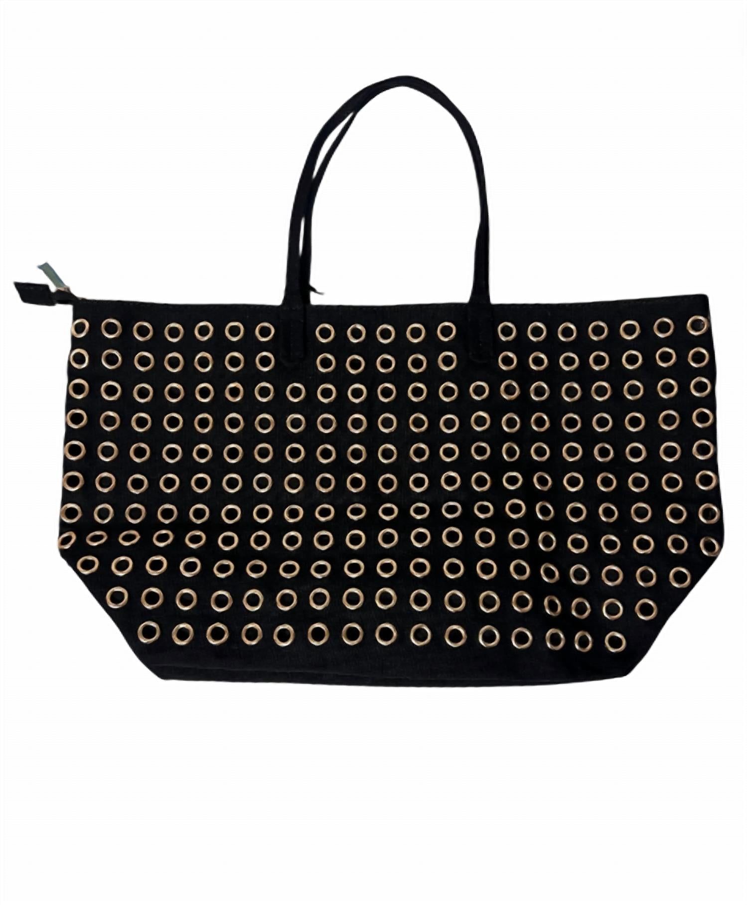 The cutest satchel bag that complements any outfit and carries just about everything you could possibly need. The Women's Eliana Grommet Canvas Tote Bag by REMI/REID is a chic and spacious accessory for your daily needs. Featuring a zip closure and stylish gold grommets, this large tote combines practicality with flair. Material: Canvas. Available in classic black.
